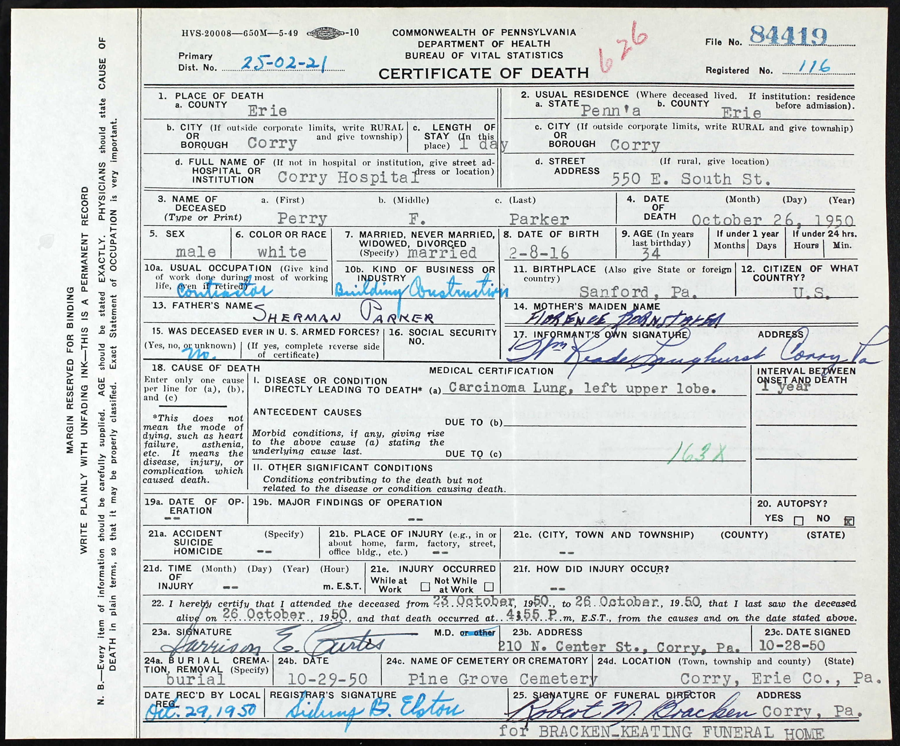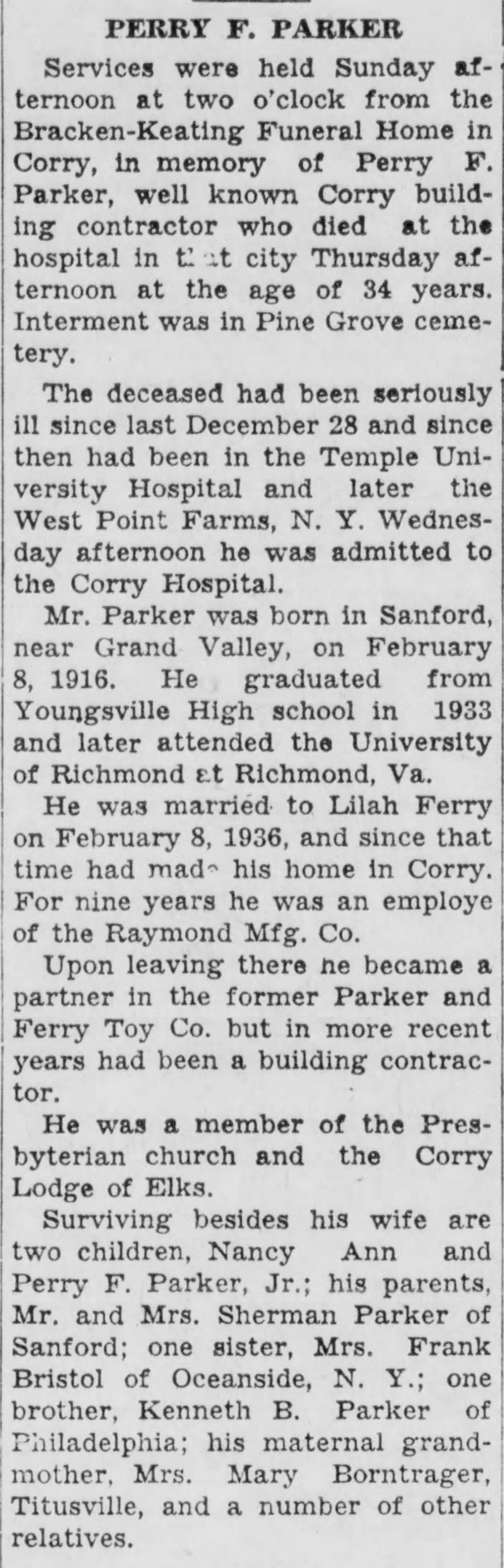 | Died: | October 26, 1950 in Corry, Erie Co, PA. View Obituary |