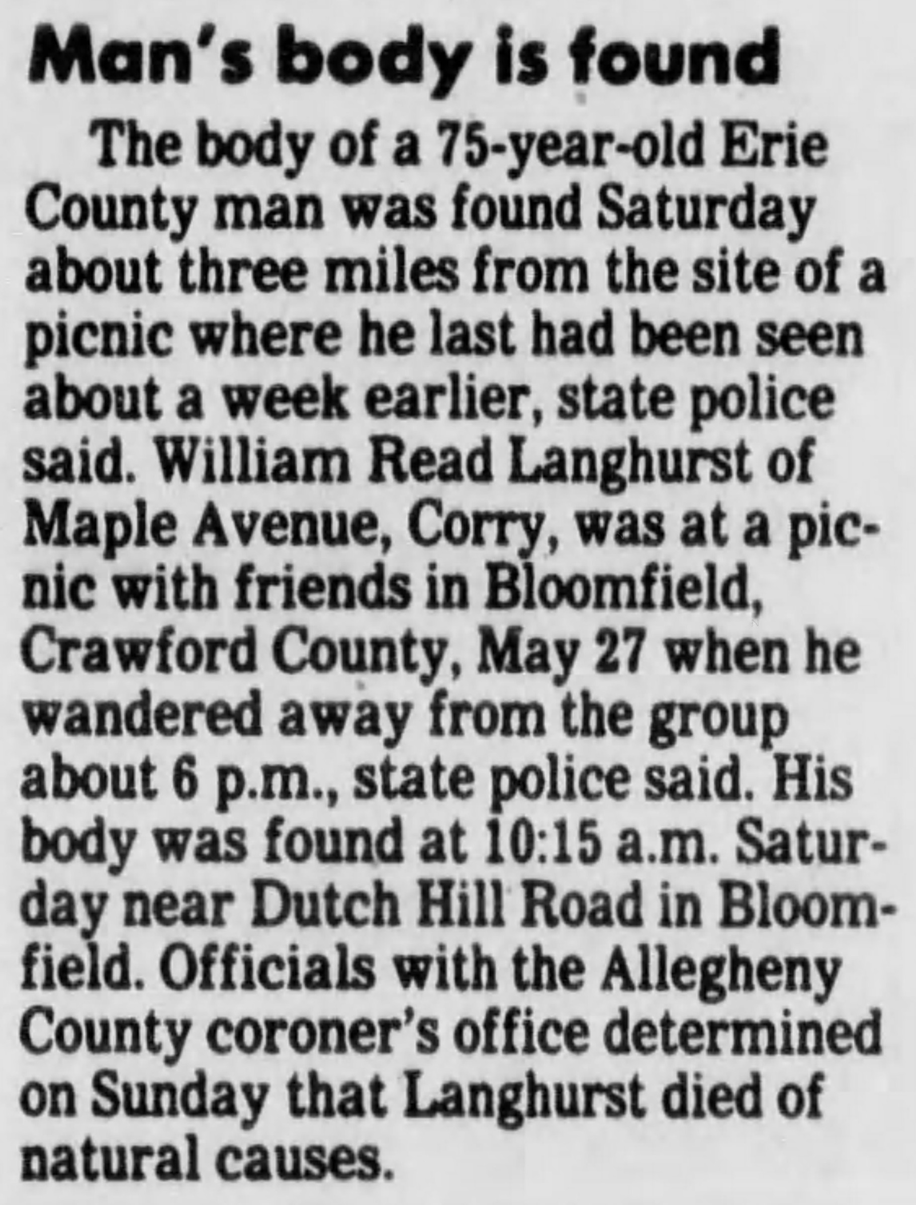 | Died: | June 2, 1990 in Corry, Erie Co, PA. |