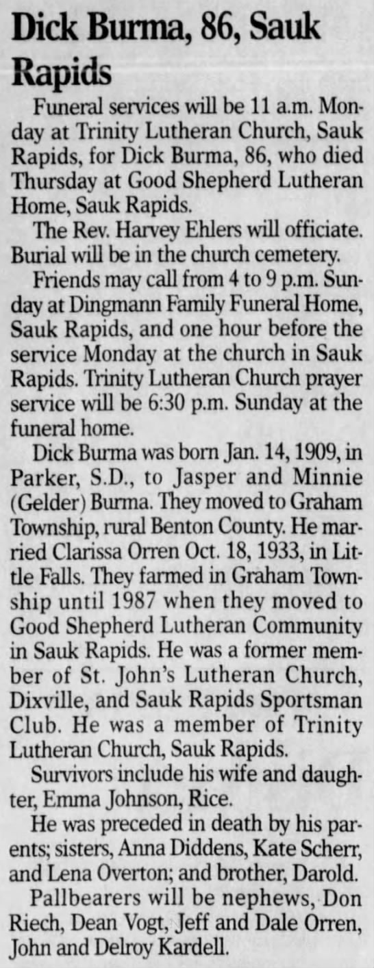 Clarissa married Richard Burma on October 18, 1933 in Little Falls, Morrison Co, MN.
