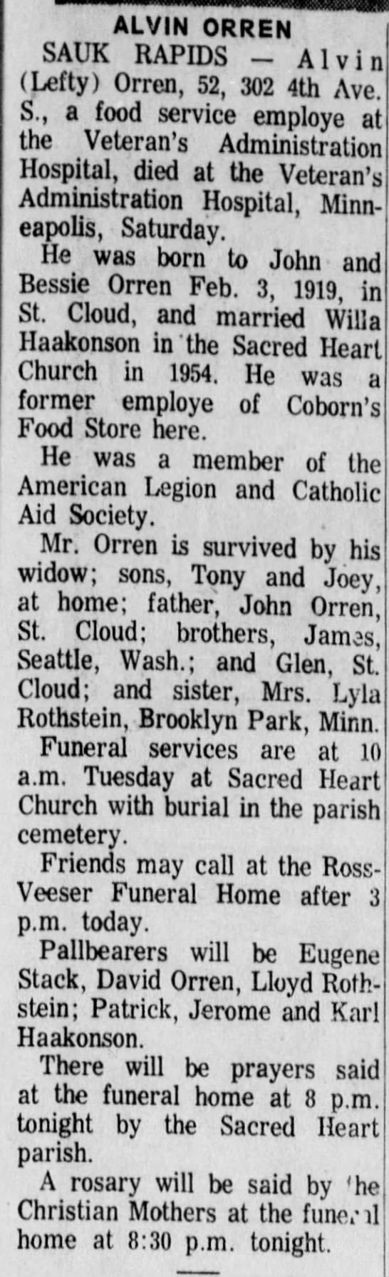 - 1940 Census - Sauk Rapids, Benton Co, MN (Listed as Alvin, age 21, son of John A. Orren)