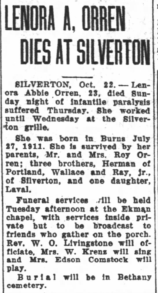 - 1930 Census - North Silverton, Marion Co, OR (Listed as Lenore A., age 18, daughter of Roy J. Orren)