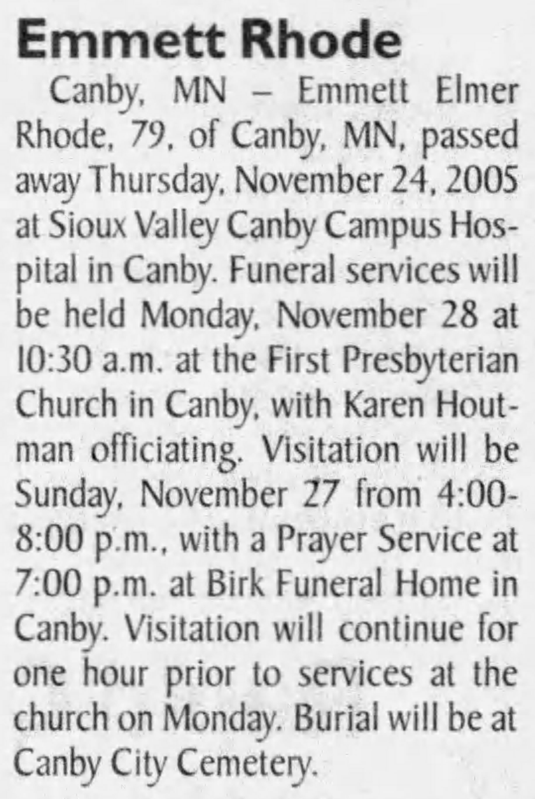 | Died: | November 24, 2005 in Canby, Yellow Medicine Co, MN. View Obituary |