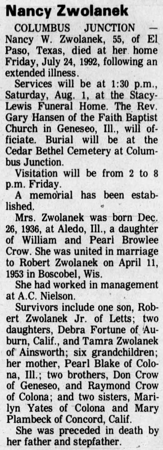 - 1940 Census - West Liberty, Muscatine Co, IA (Listed as Robert, age 8, son of Robert Zwalanck)