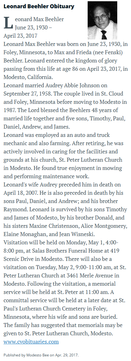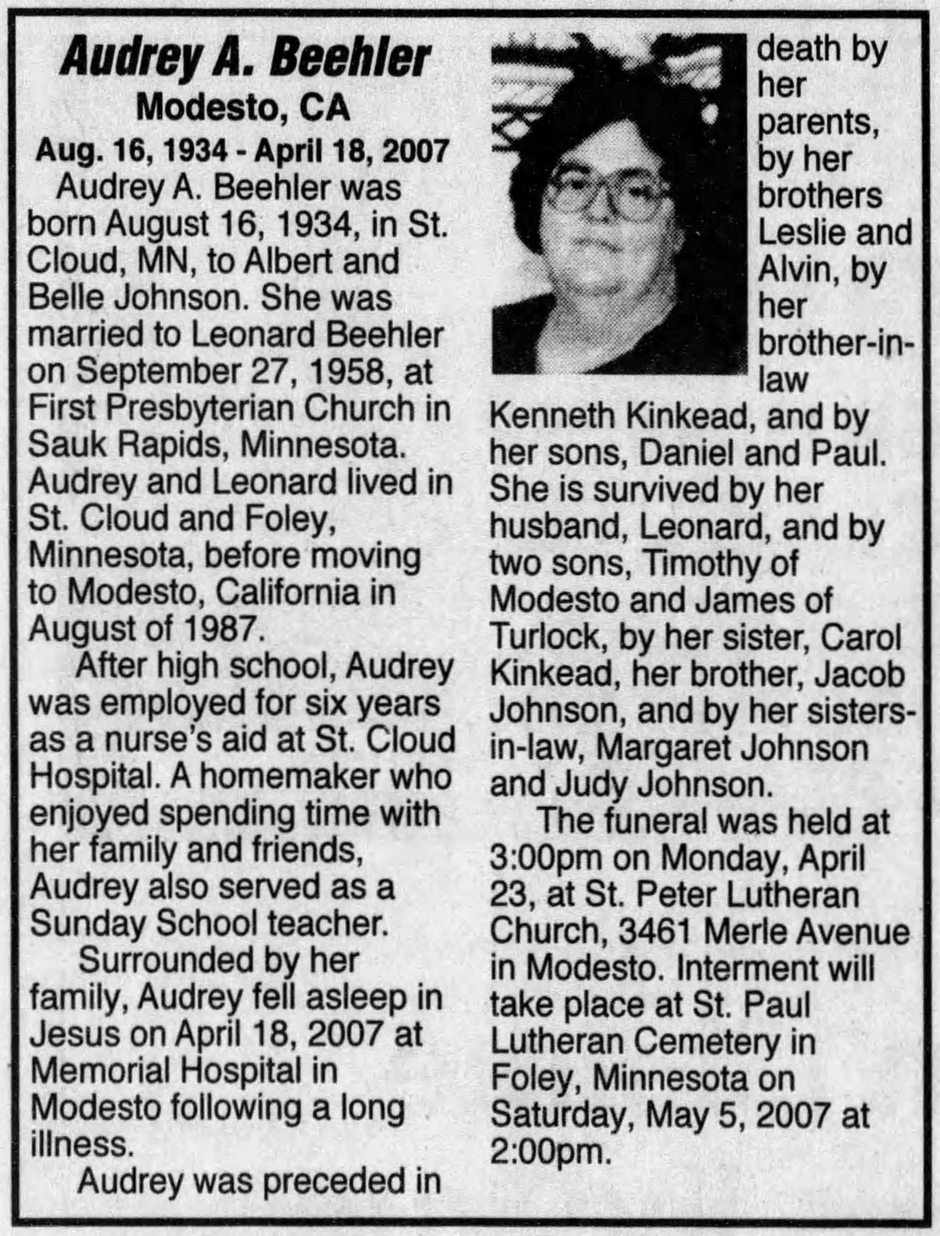 Audrey married Leonard Max Beehler on September 27, 1958 in Sauk Rapids, Benton Co, MN.