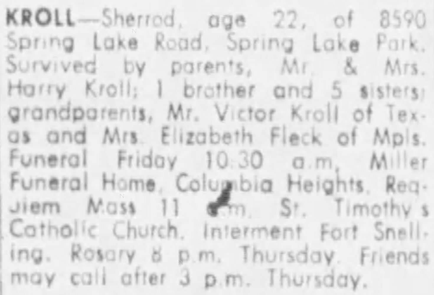 - 1950 Census - Lakin Township, Morrison Co, MN (Listed as Sharrod H., age 9, son of Vernie C. Kroll)