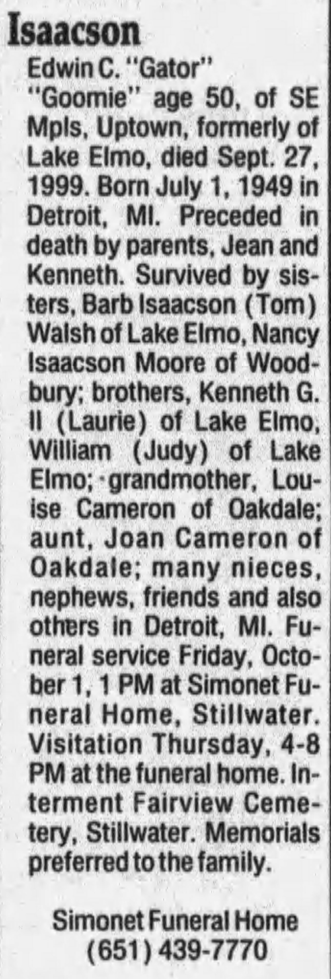 | Died: | September 27, 1999 in Minneapolis, Hennepin Co, MN. View Obituary |