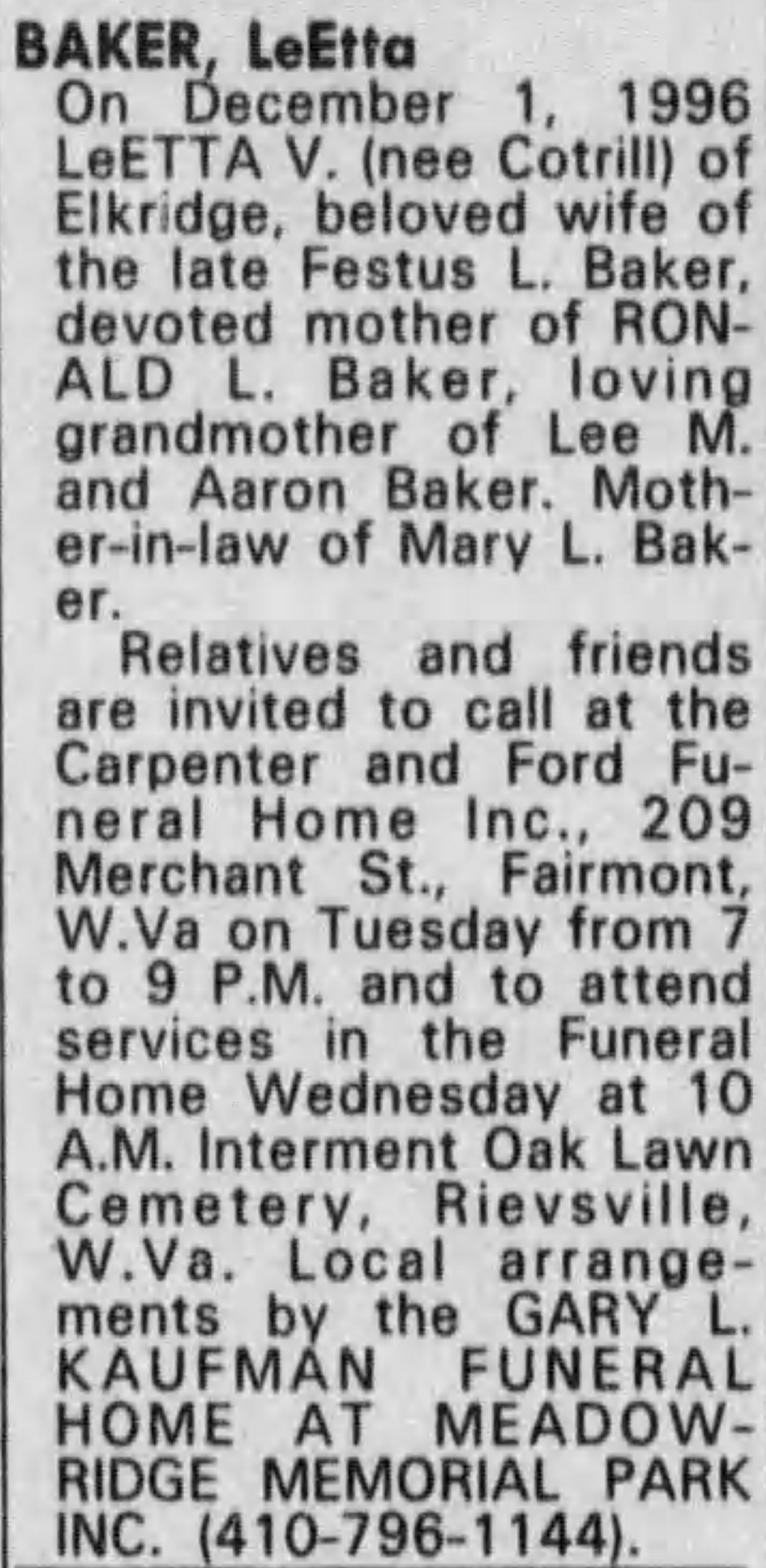 - 1950 Census - Paw Paw, Marion Co, WV (Listed as Leetta, age 41, wife of Festus L. Baker)