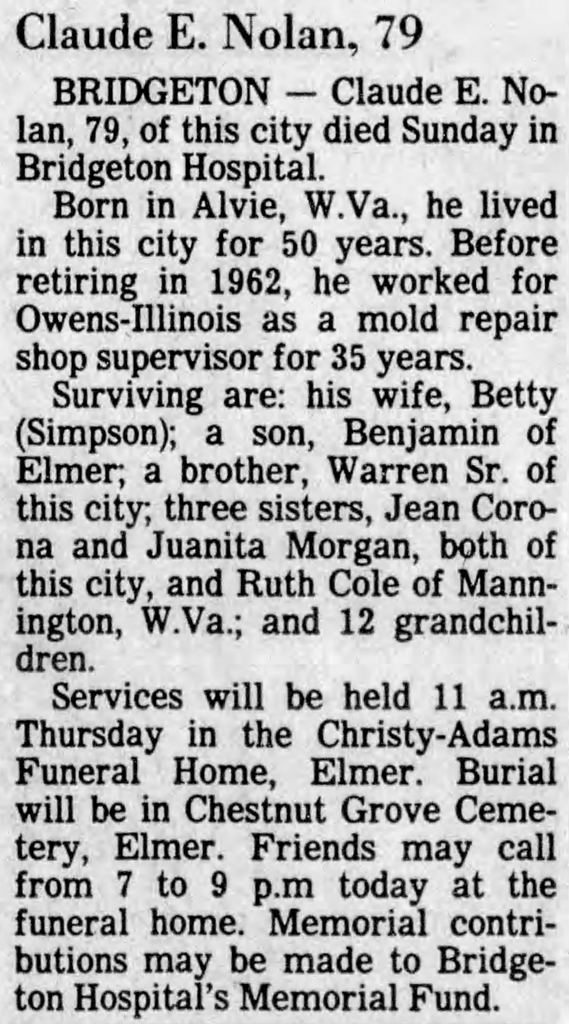 - 1950 Census - Bridgeton, Cumberland, NJ (Listed as Claude E. Nolan, age 44, head of household)