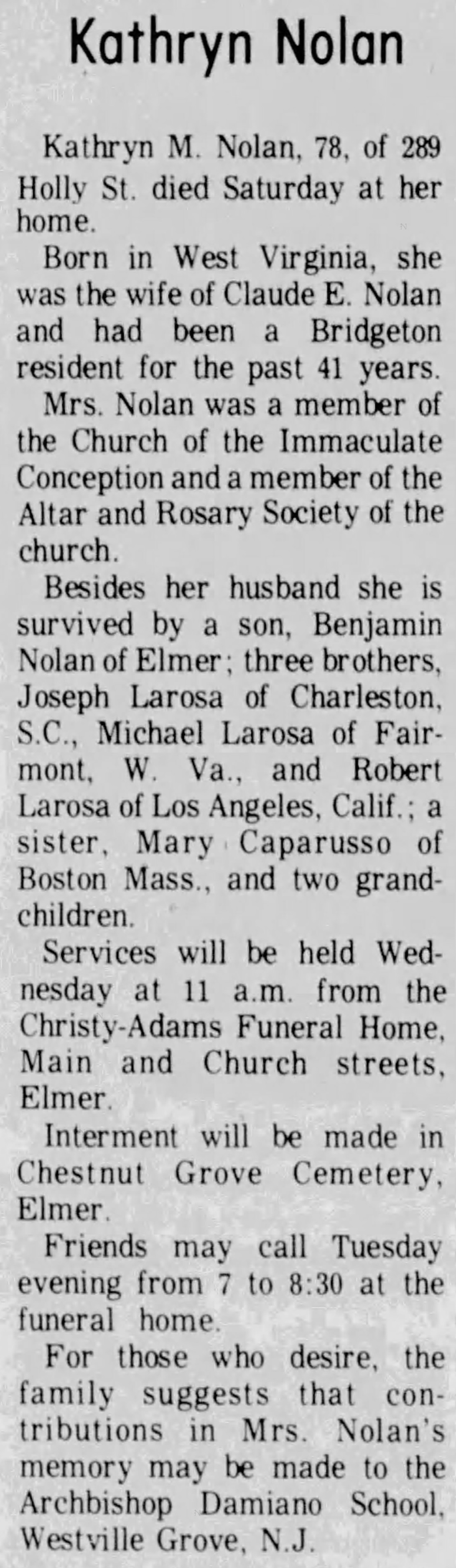 - 1940 Census - Bridgeton, Cumberland, NJ (Listed as Claude Nolan, age 34, head of household)