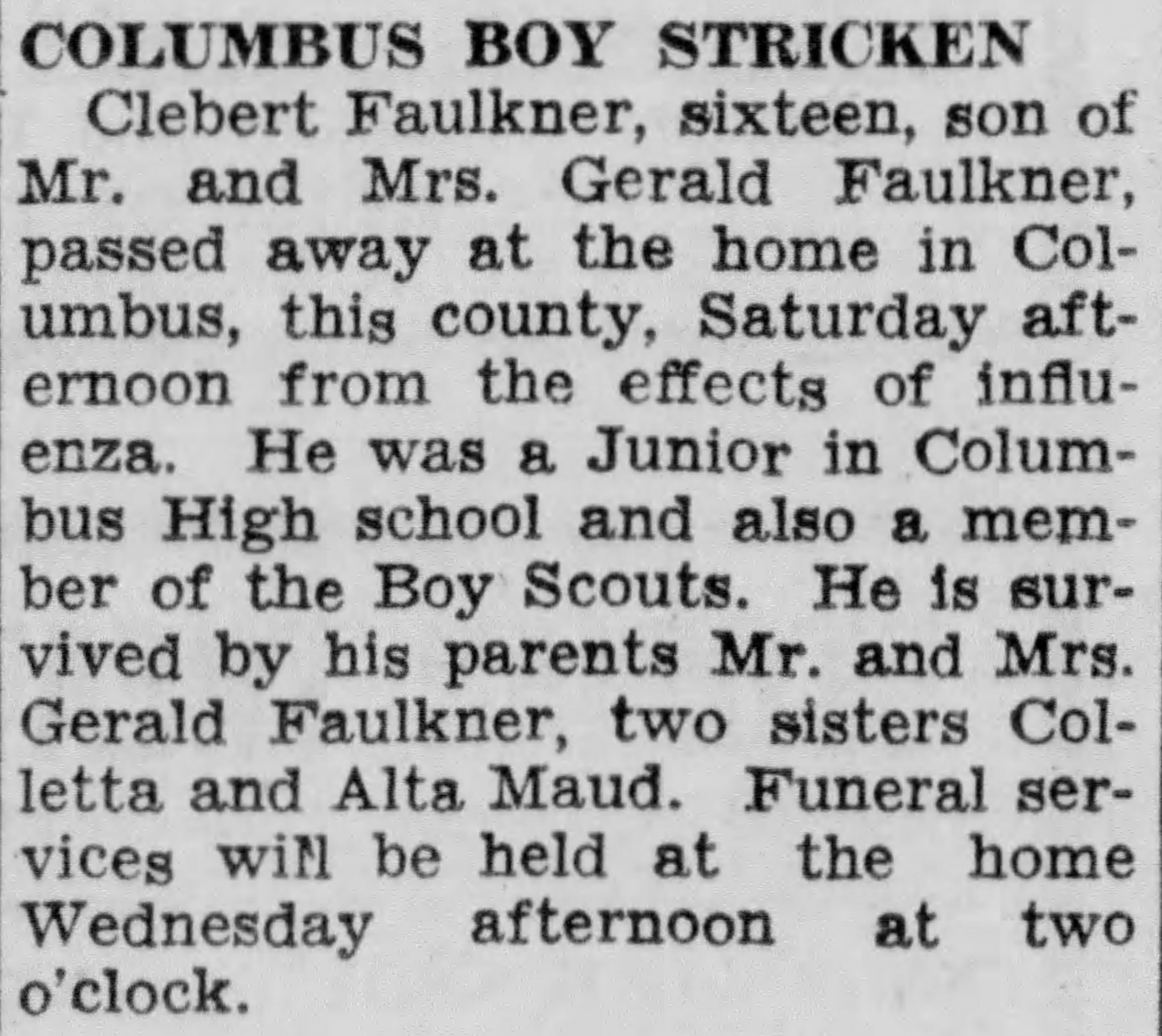 - 1920 Census - Columbus, Warren Co, PA (Listed as Clebert Faulkner, age 1 7/12, son of Gerald Faulkner)
