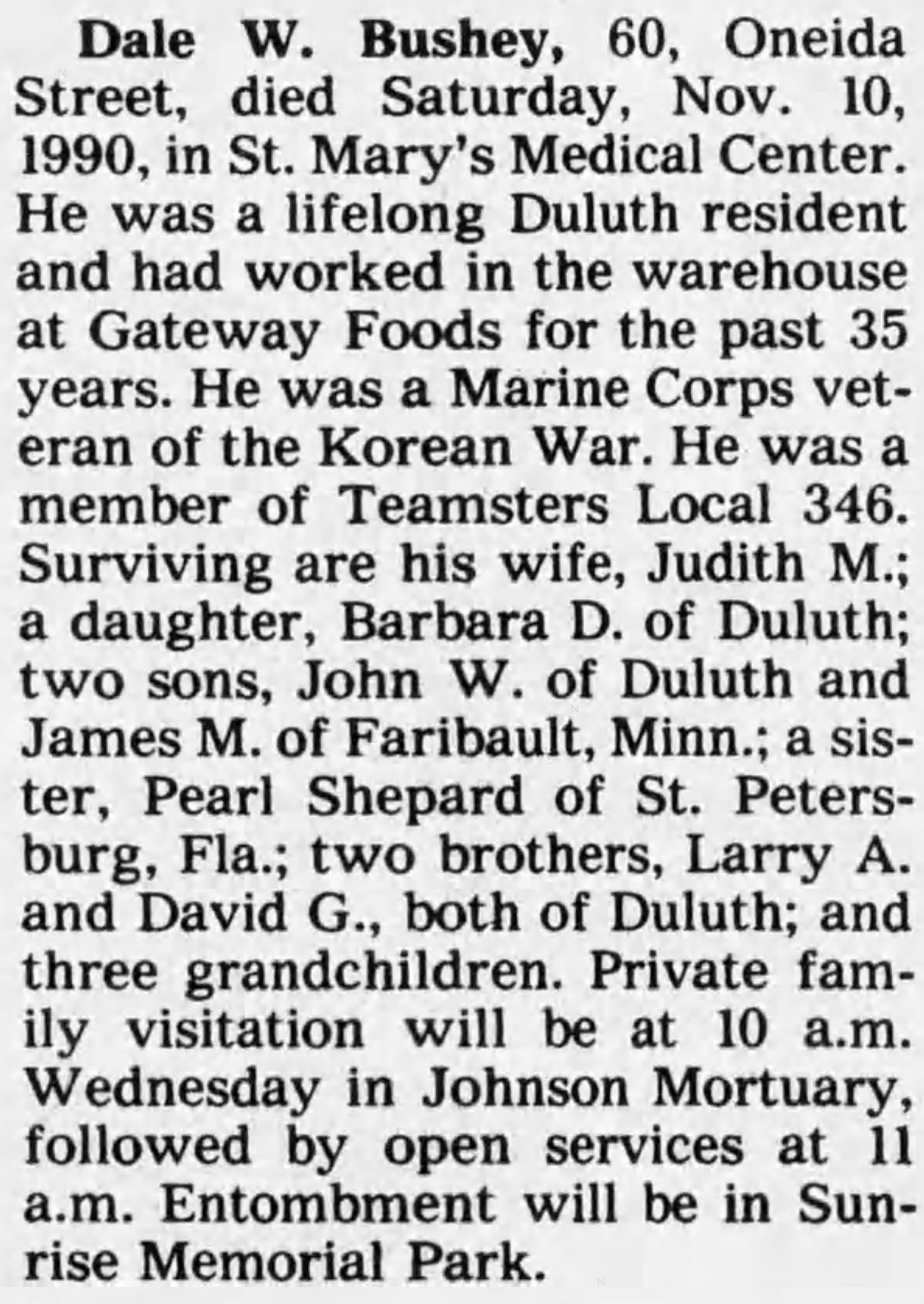 Judith married Dale Warren Bushey on September 11, 1954 in St. Louis County, MN.
