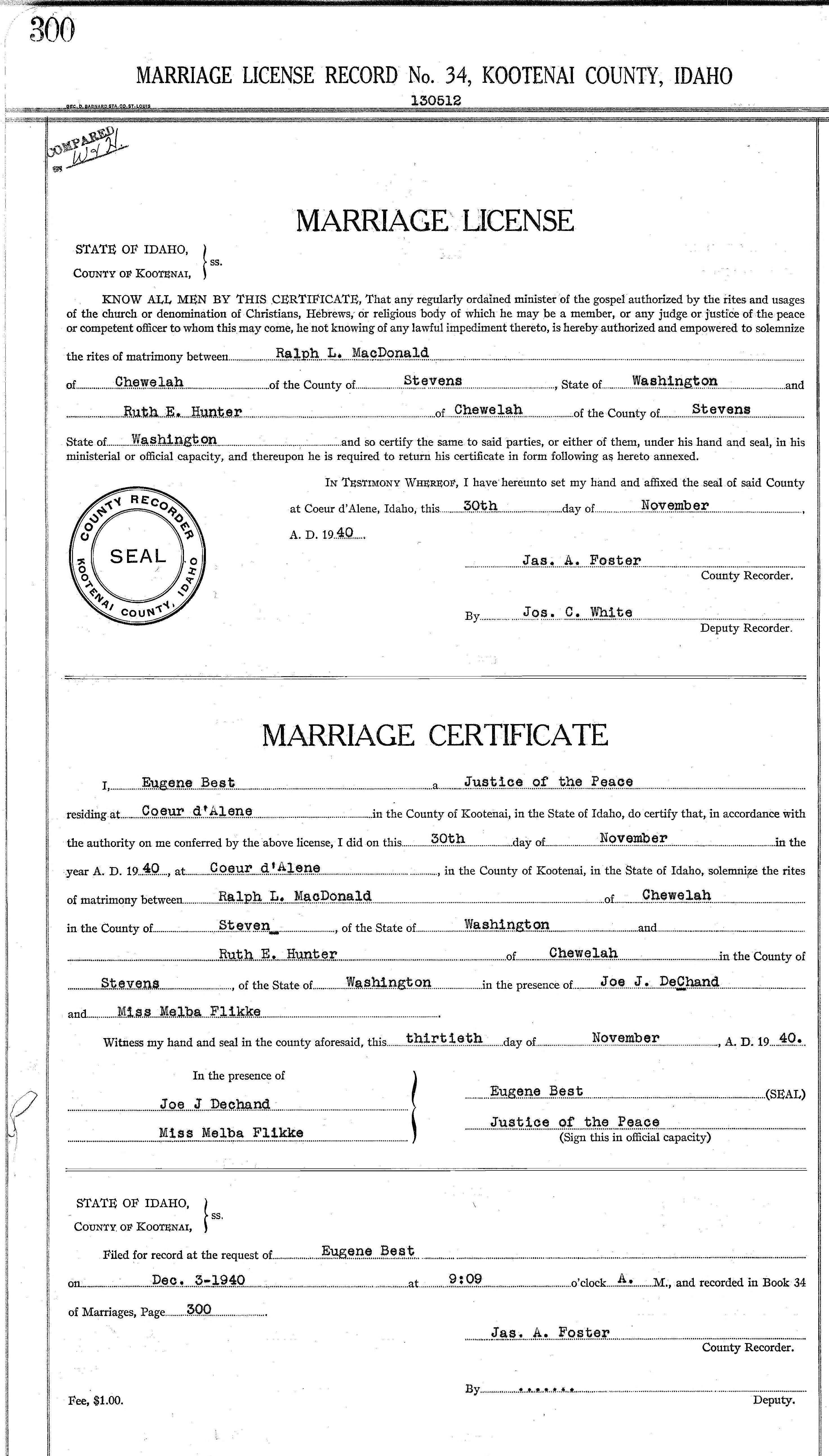 - 1940 Census - Dalton, Kootenai Co, ID (Listed as Ruth E. Hunter, age 19, granddaughter of Sophia A. Estey)