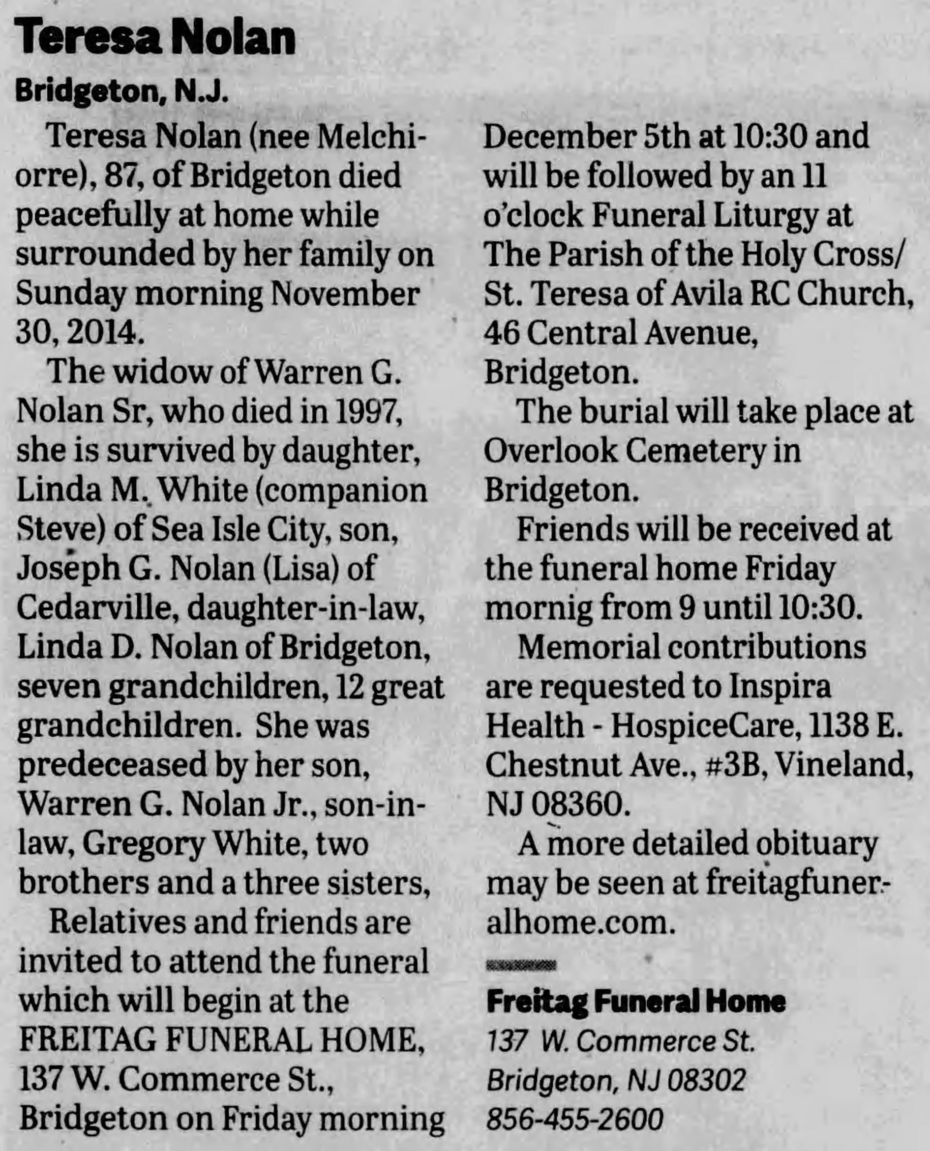 | Died: | November 30, 2014 in Bridgeton, Cumberland Co, NJ. View Obituary |