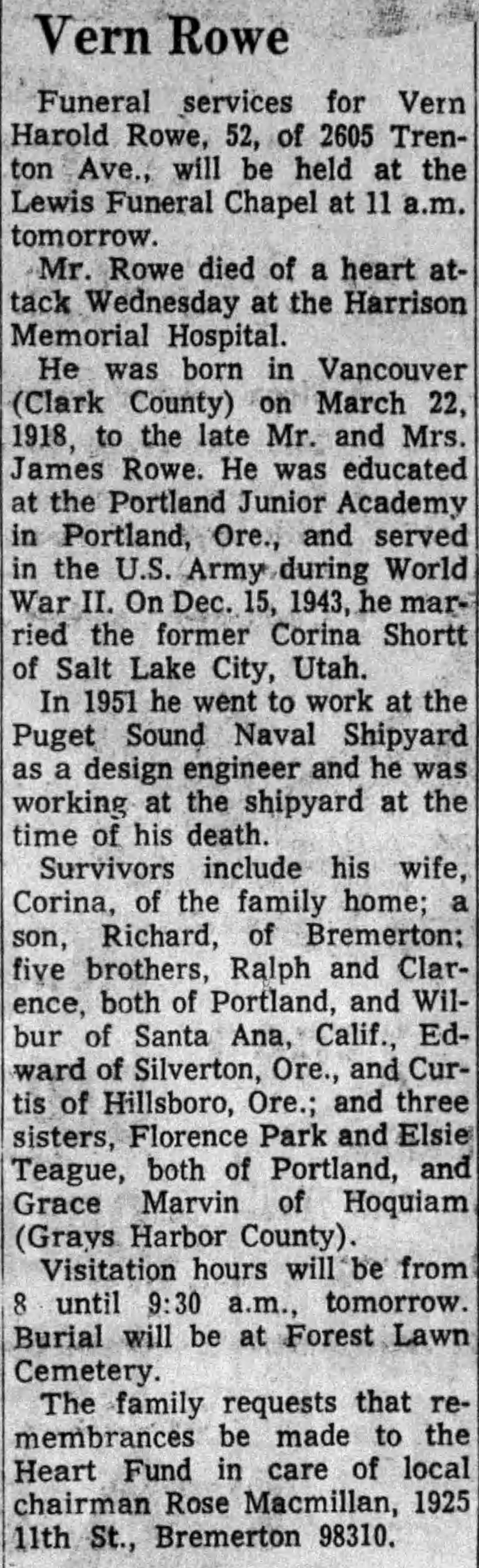 Evangeline married Vern Harold Rowe on October 18, 1937 in Vancouver, Clark Co, WA. They later divorced.