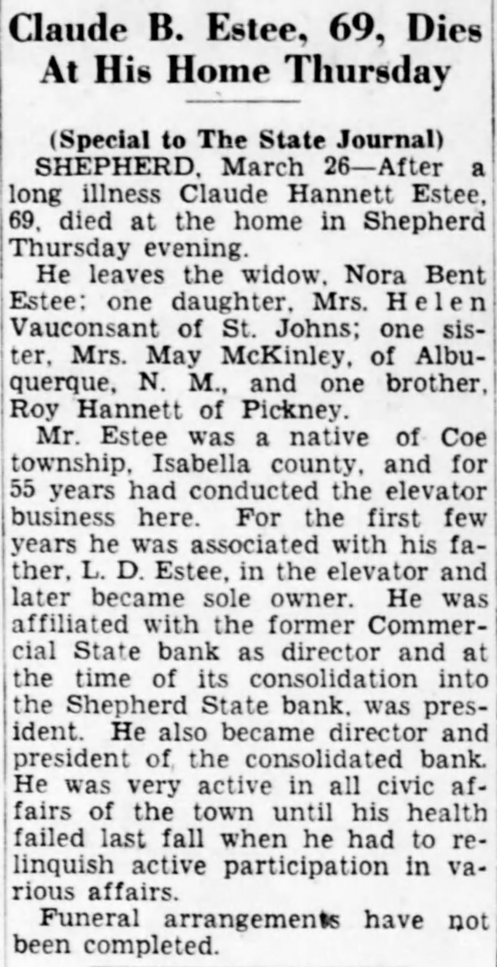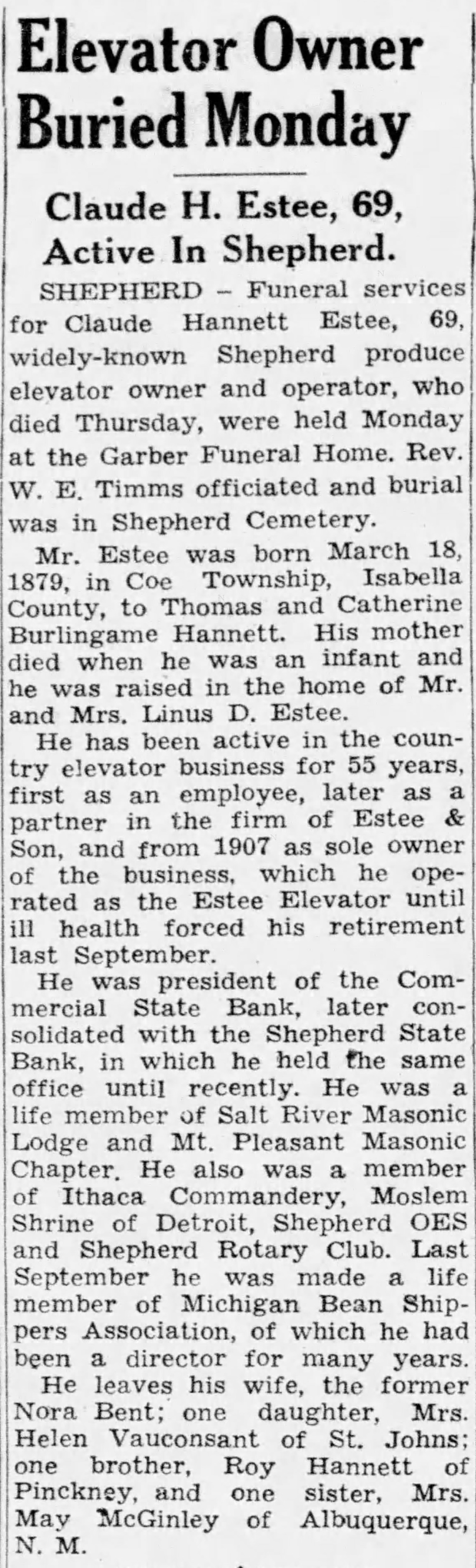 | Died: | December 7, 1958 in St. Johns, Clinton Co, MI. |