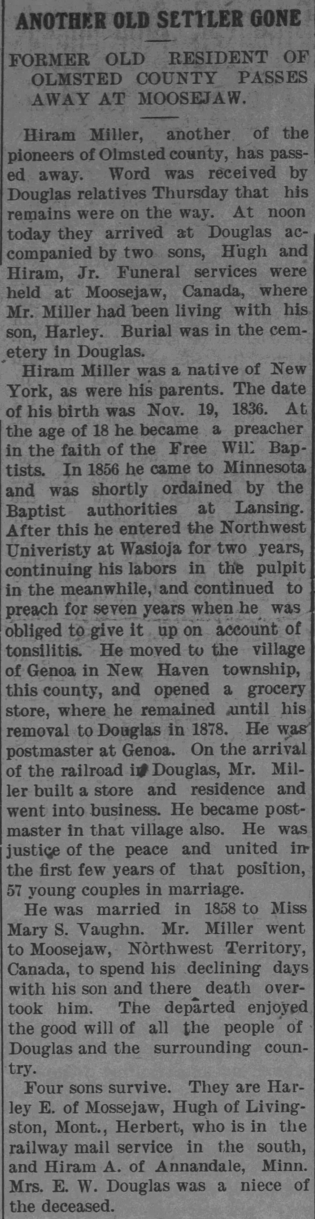 - 1900 Census - Cascade, Olmsted Co, MN (Listed as Hiram, age 63, father of Harlen Miller)