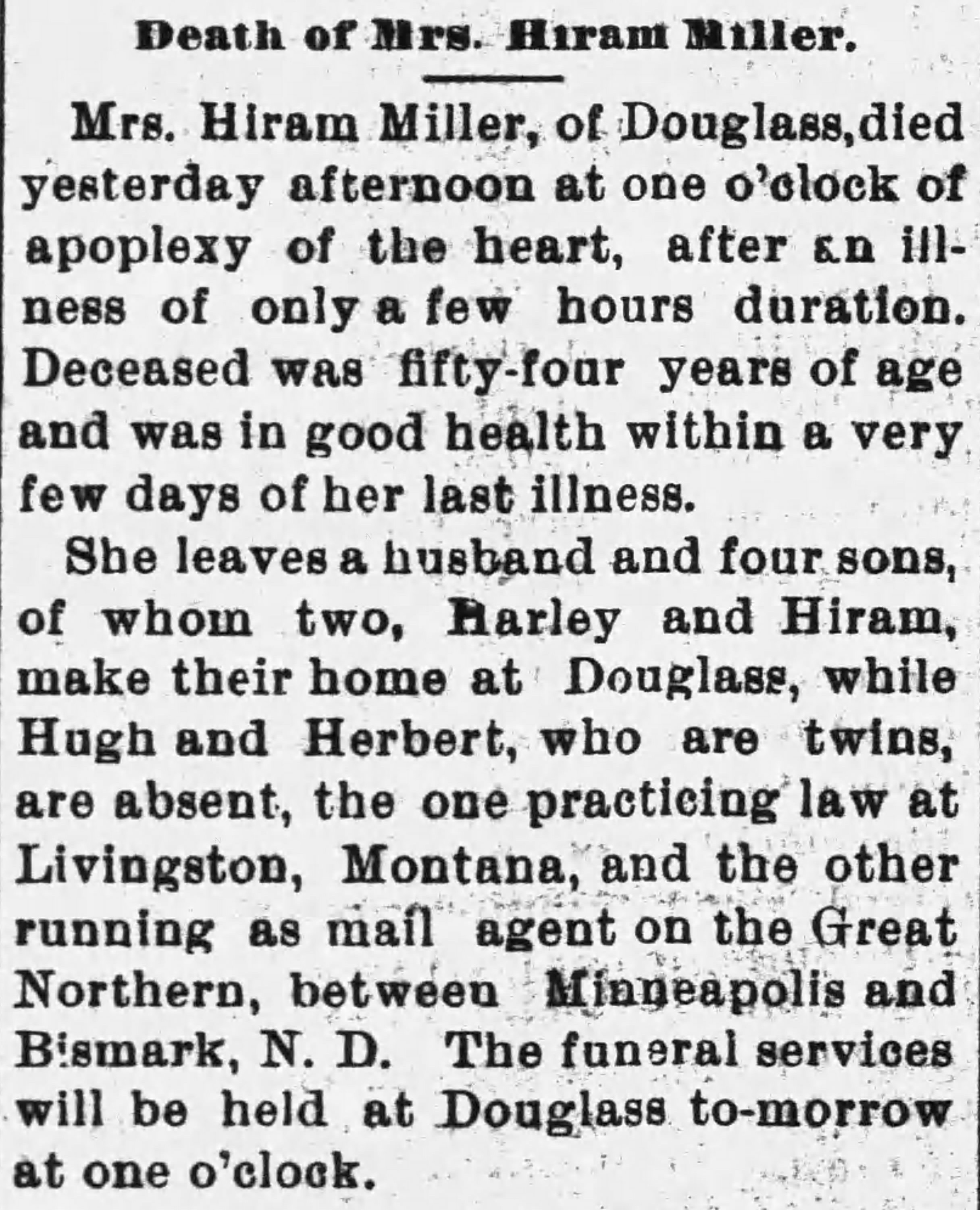 - 1880 Census - Kalmar, Olmsted Co, MN (Listed as Hiram Miller, age 43, head of household)