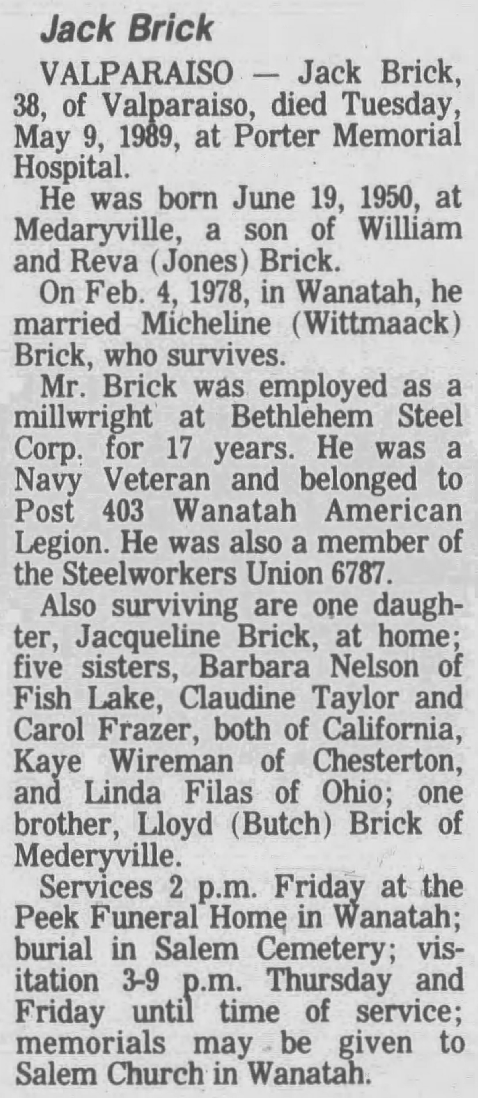 | Died: | May 9, 1989 in Valparaiso, Porter Co, IN. View Obituary |