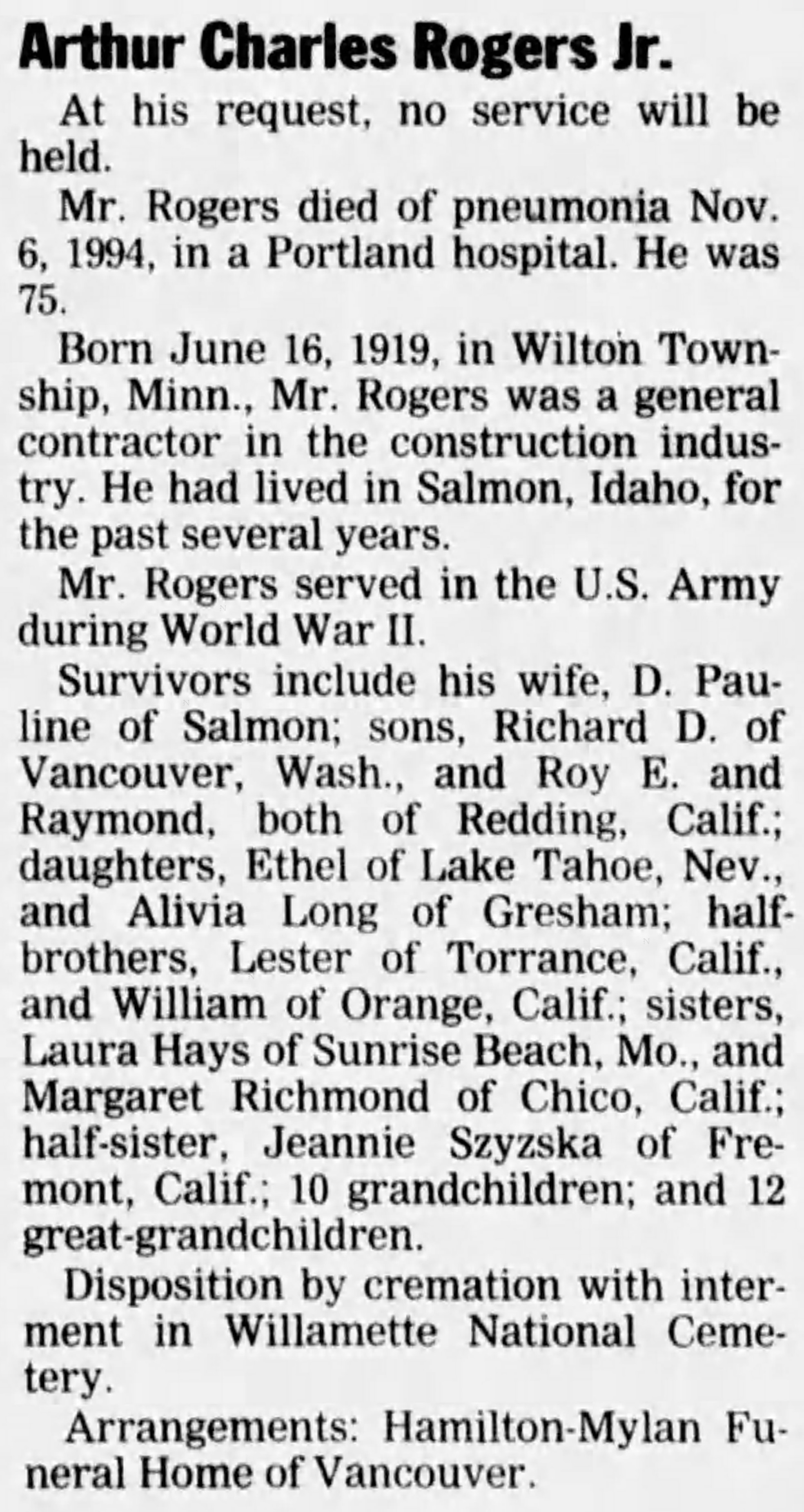 | Died: | November 6, 1994 in Portland, Multnomah Co, OR. View Obituary |
