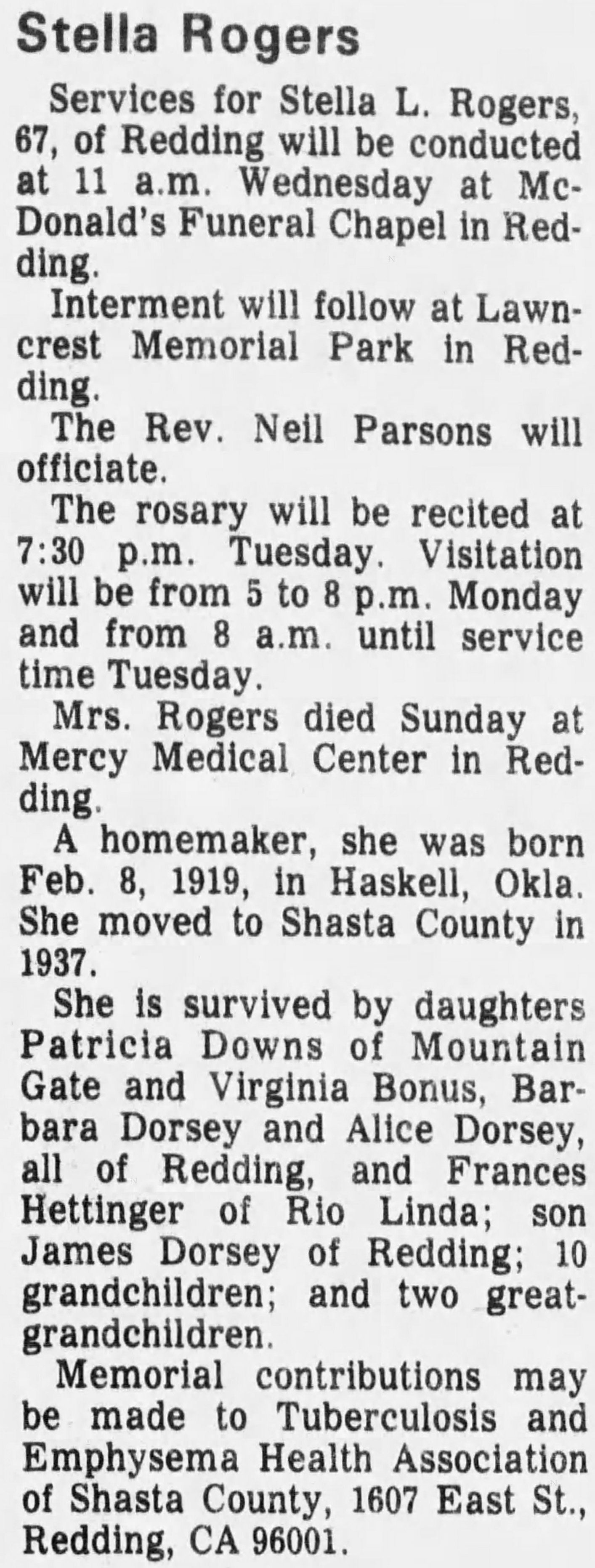 | Buried: | Lawncrest Memorial Park, Redding, Shasta Co, CA. |