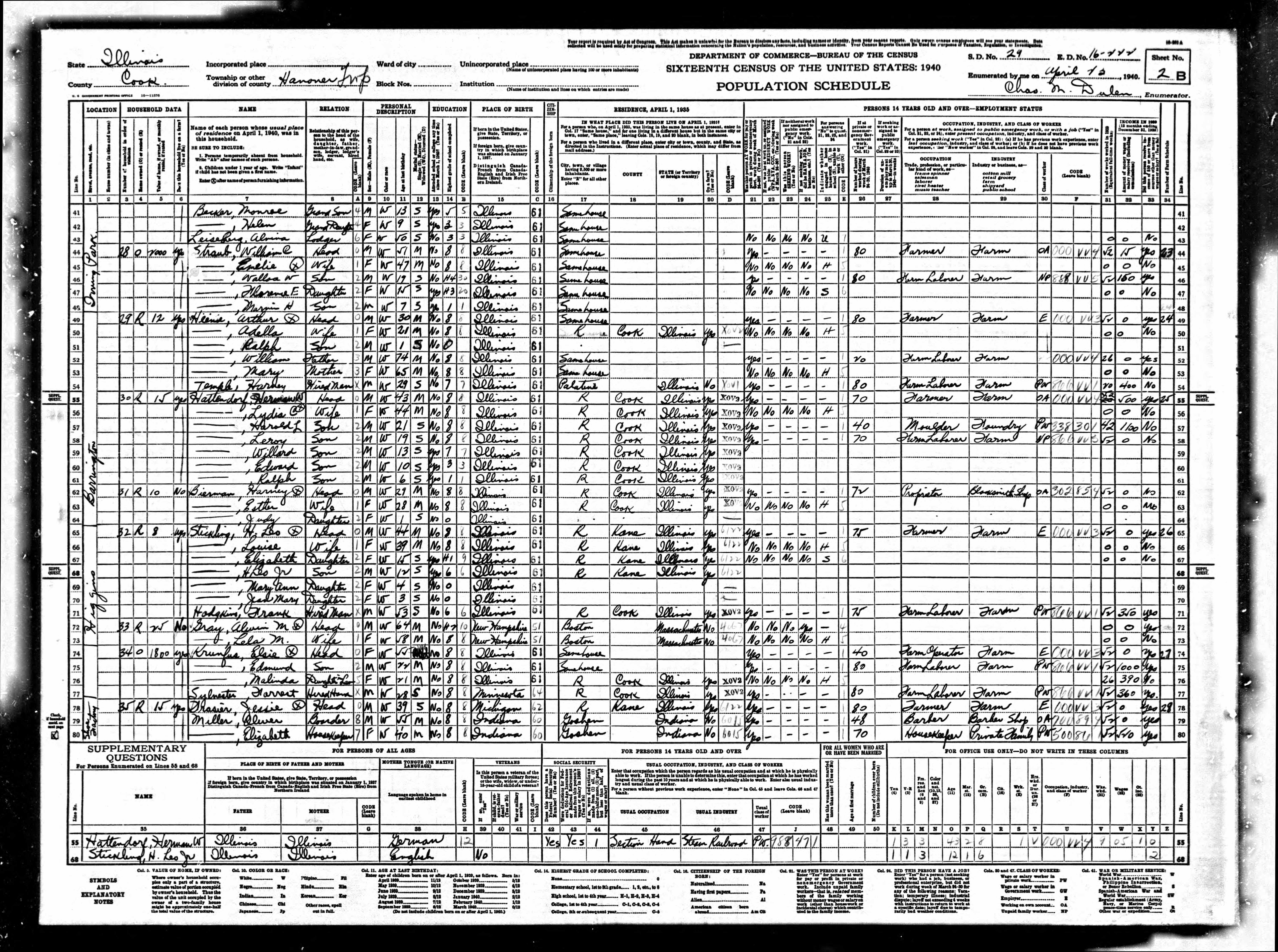 - 1940 Census - Hanover, Cook Co, IL (Listed as Forrest Sylvester, age 28, hired hand of Elsie Krunfus)