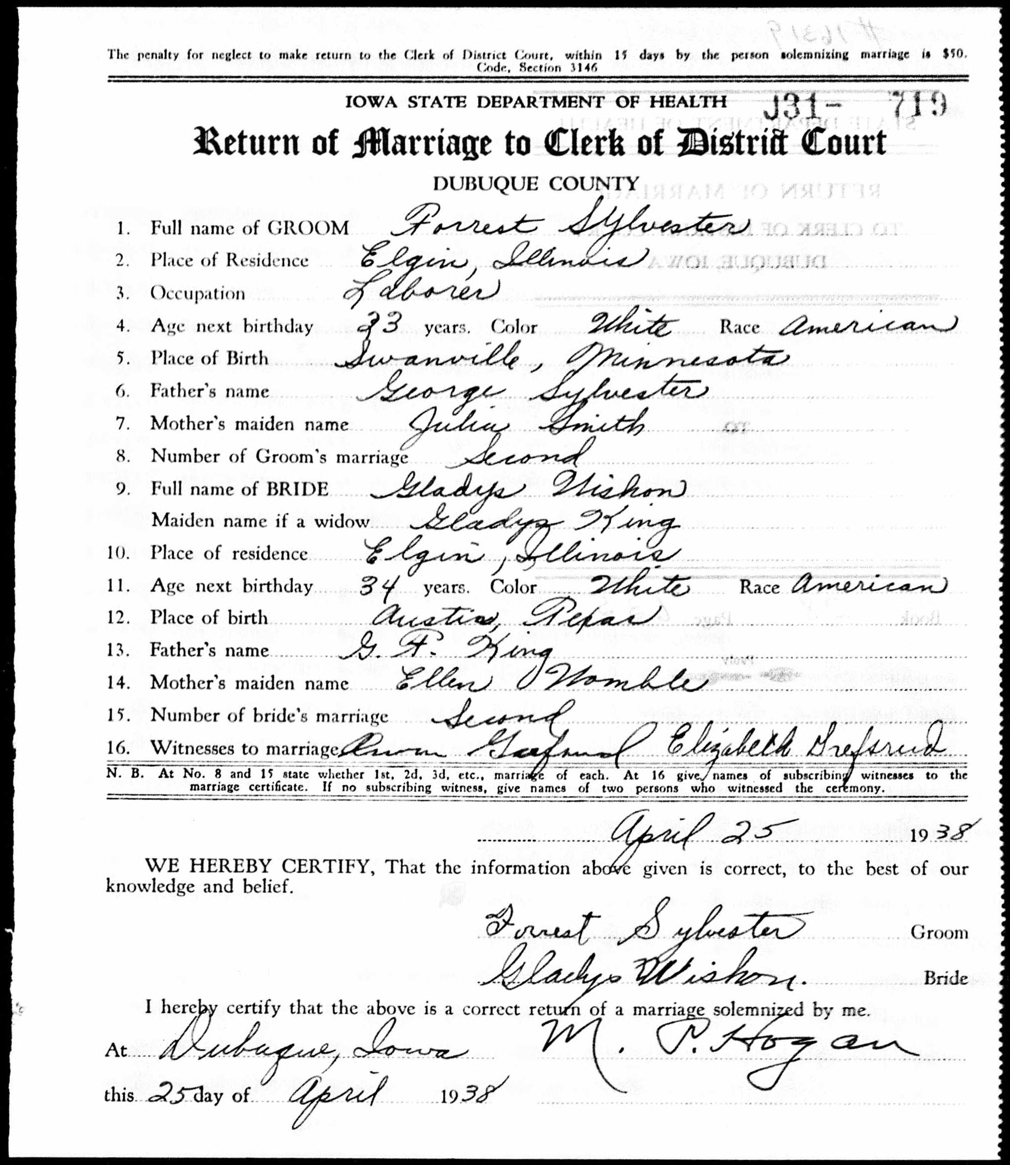 Forest married Gladys M. King on April 25, 1938 in Dubuque, Dubuque Co, IA.