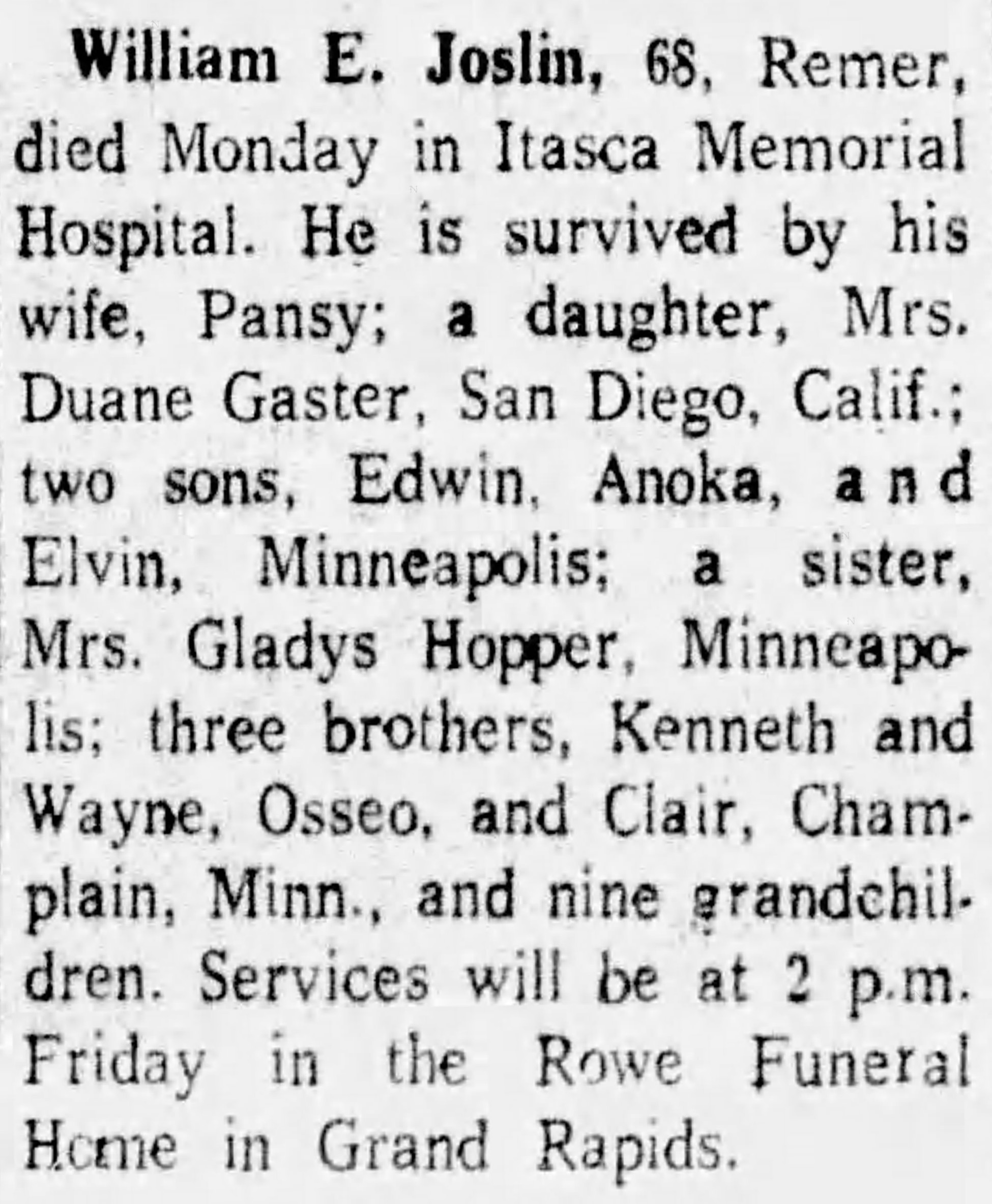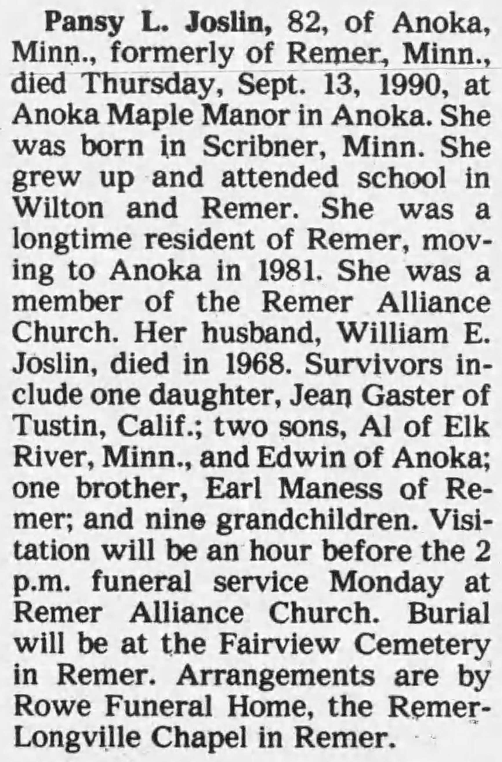 - 1940 Census - Remer, Cass Co, MN (Listed as Pansy, age 31, wife of William E. Joslin)