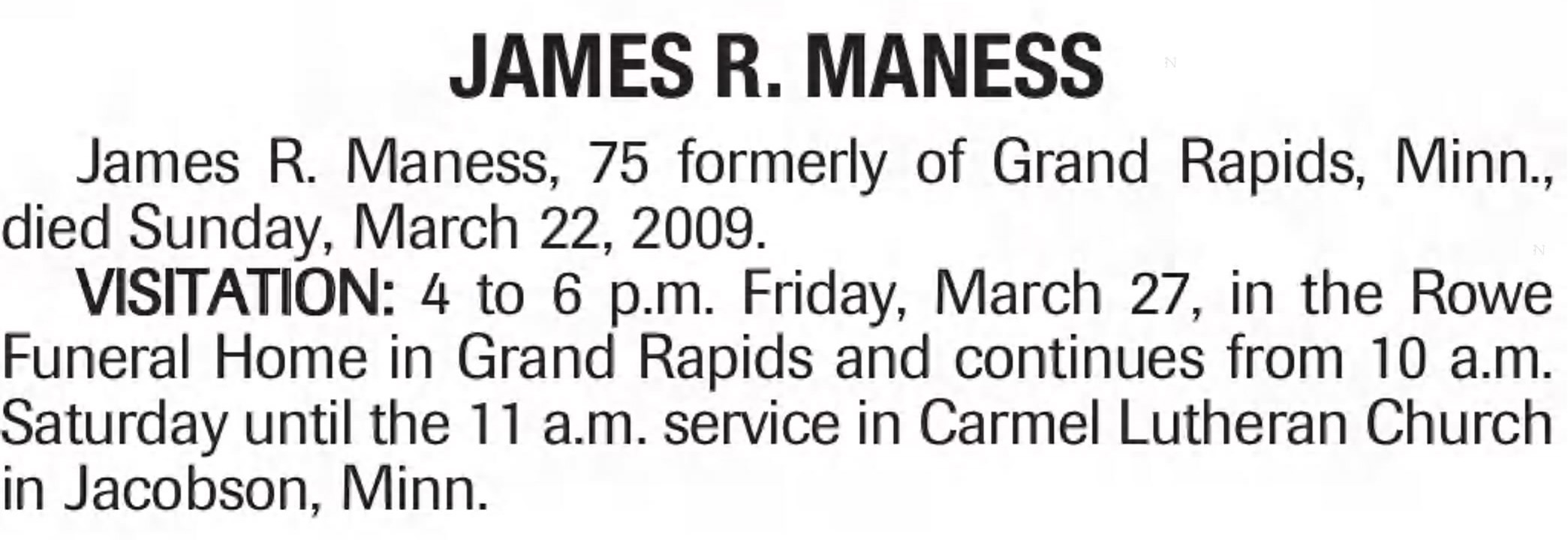 - 1940 Census - Grand Rapids, Itasca Co, MN (Listed as James, age 6, son of Ralph Manness)