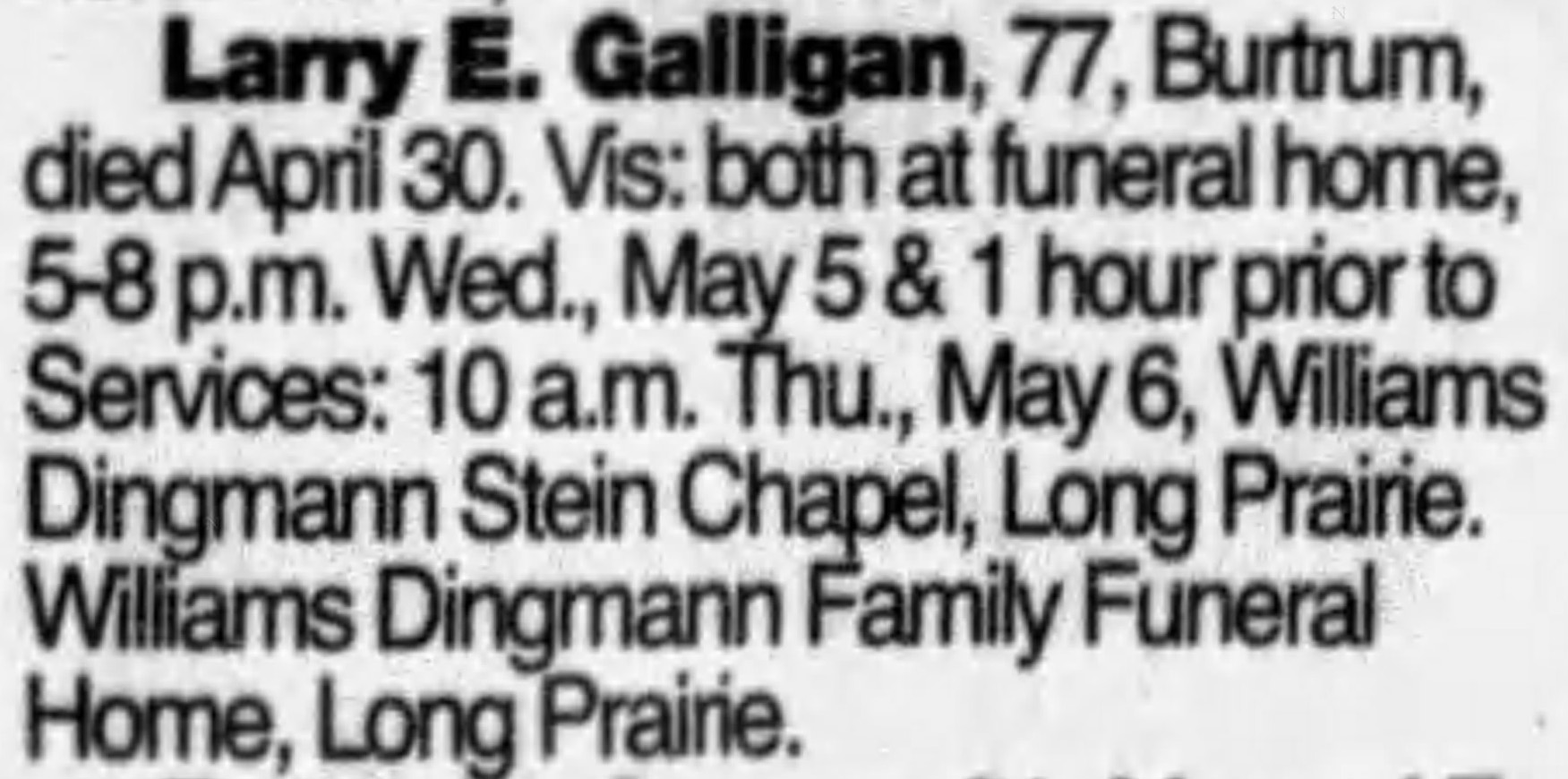 - 1940 Census - Round Prairie Township, Todd Co, MN (Listed as Larry E., age 7, son of Edward F. Galligan)