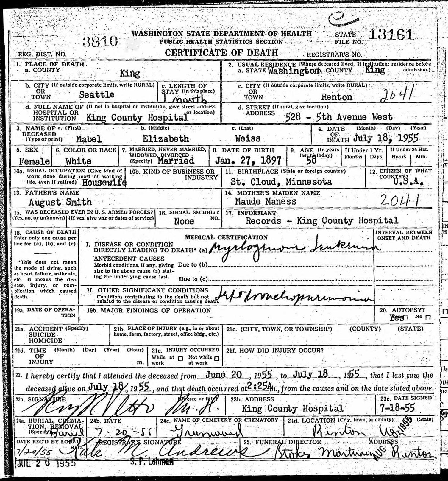 | Died: | July 18, 1955 in Seattle, King Co, WA. |