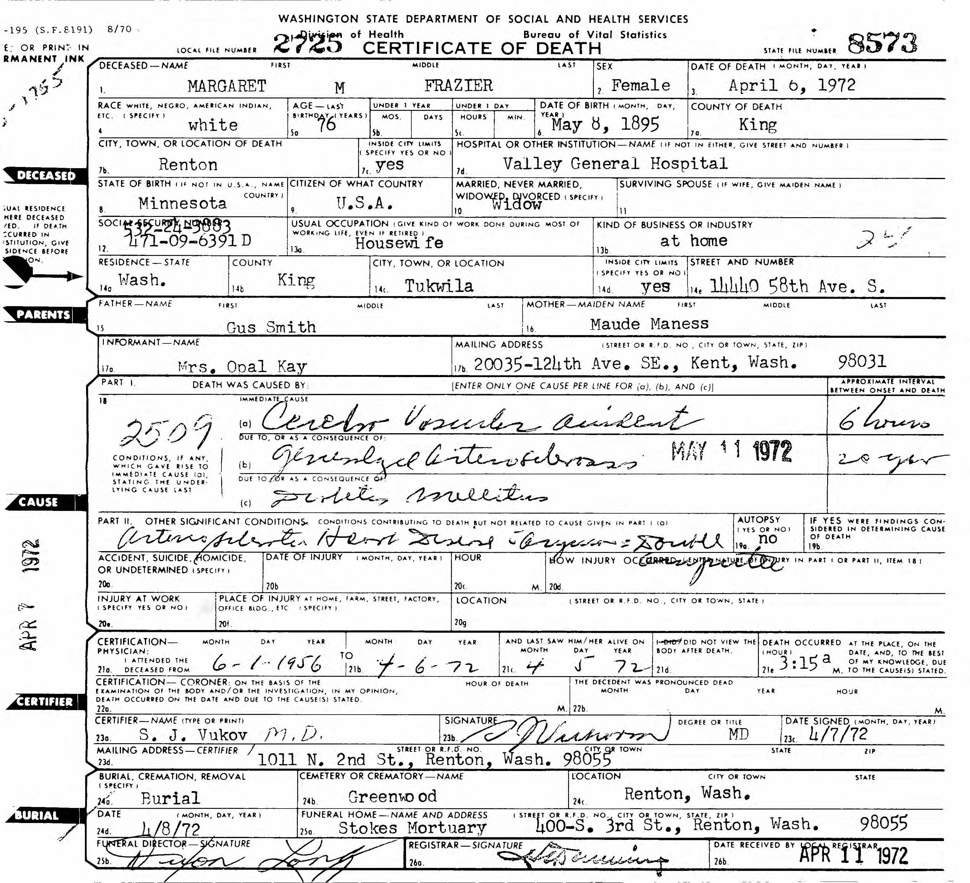 | Died: | April 6, 1972 in Renton, King Co, WA. |