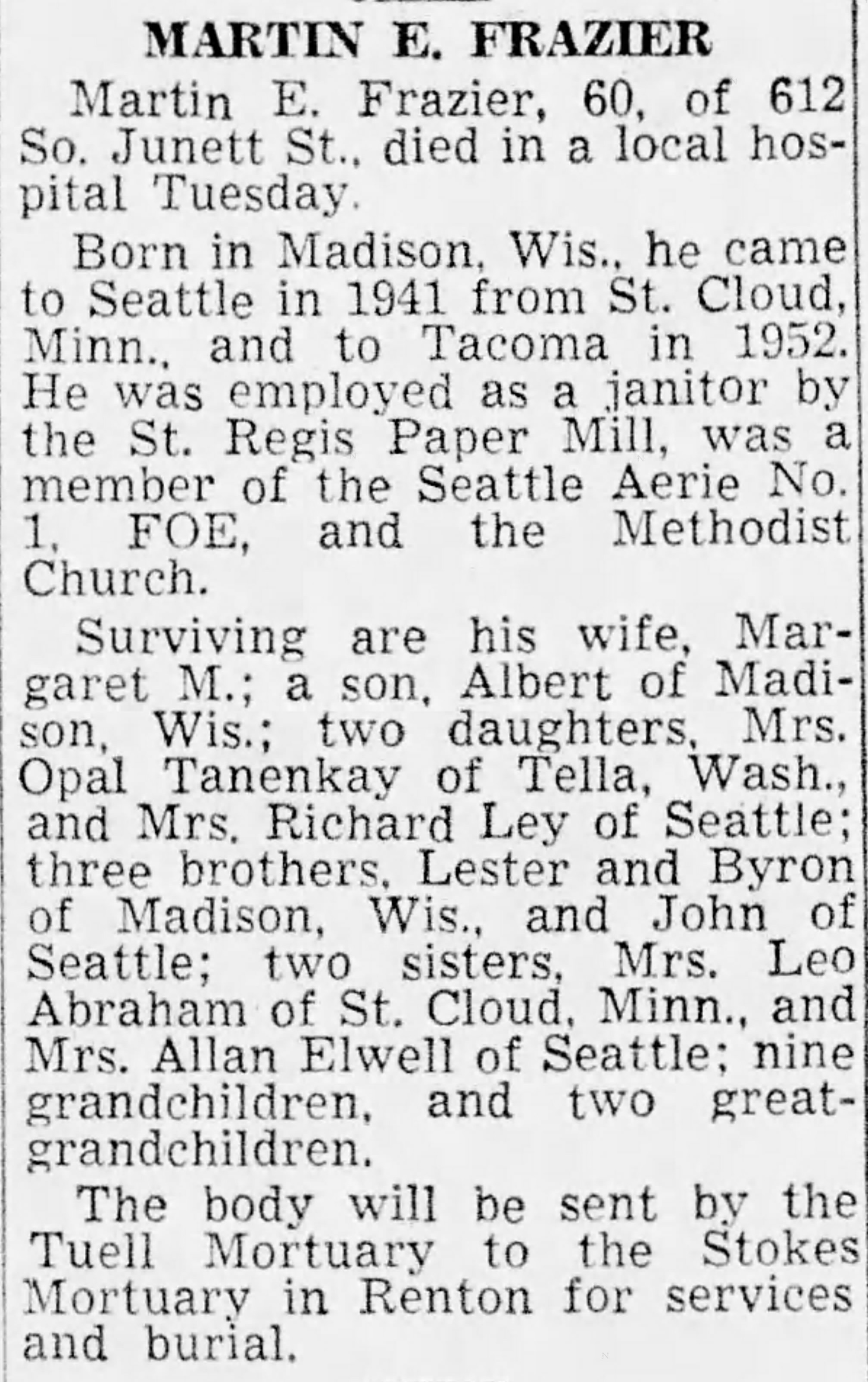 - 1950 Census - Tukwila, King Co, WA (Listed as Margaret, age 53, wife of Martin Frazier)