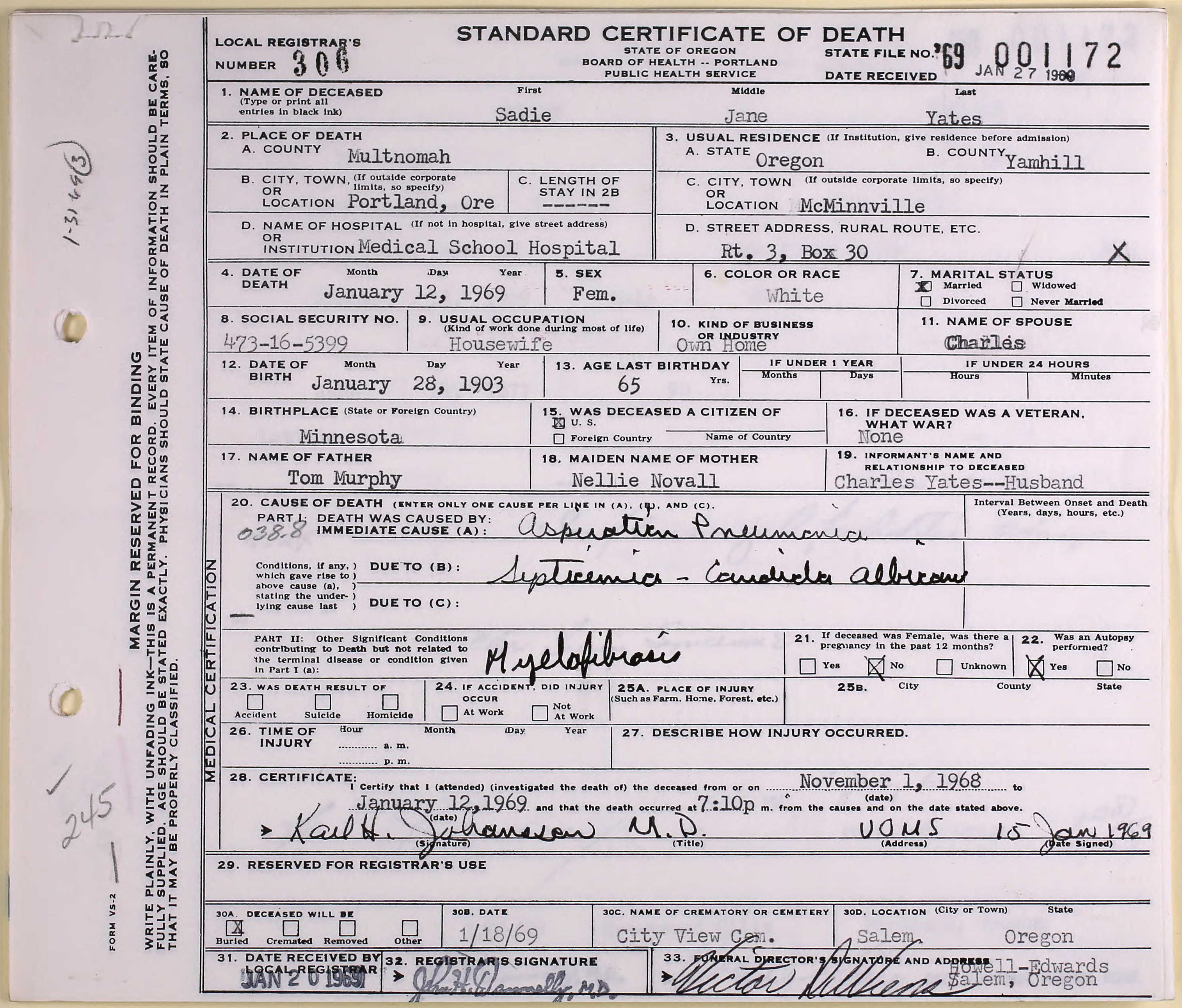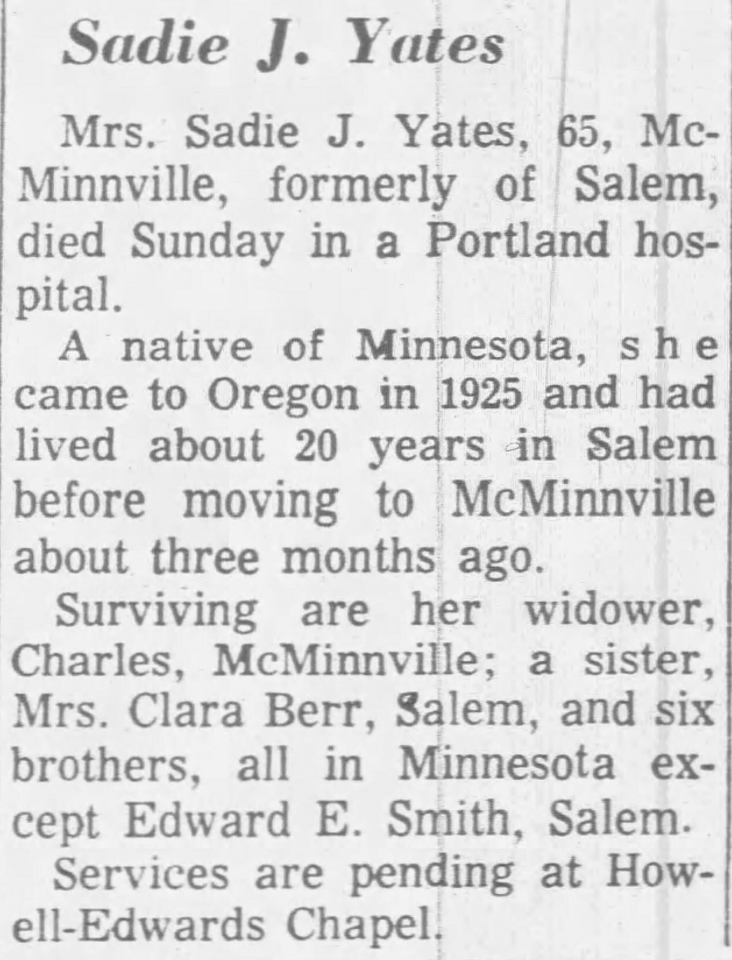 Sadie married Charles W. Yates on March 6, 1948 in Vancouver, Clark Co, WA.