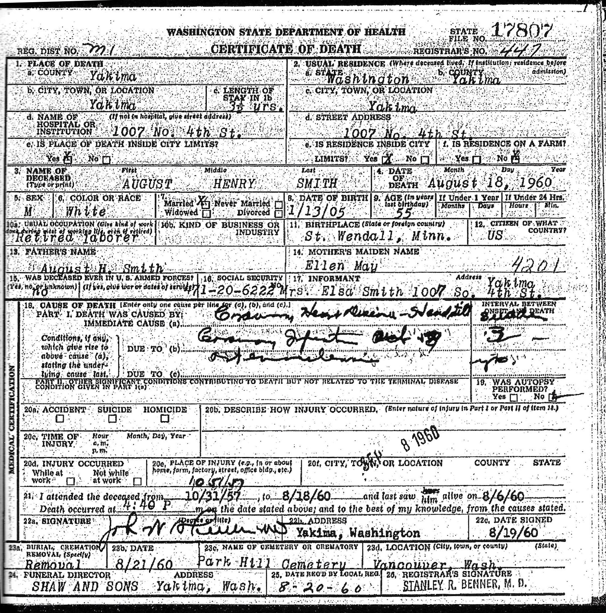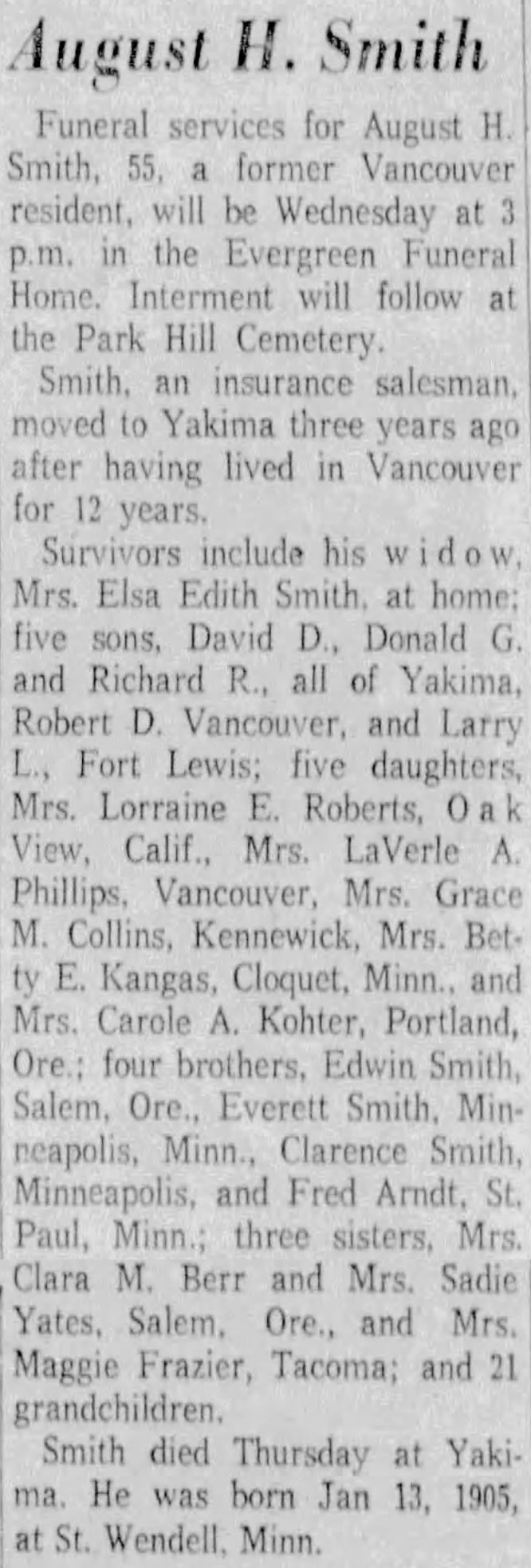- 1950 Census - Vancouver, Clark Co, WA (Listed as August H. Smith, age 45, head of household)