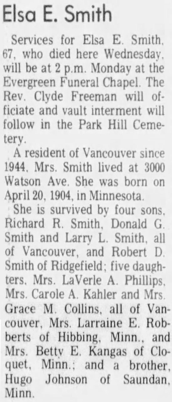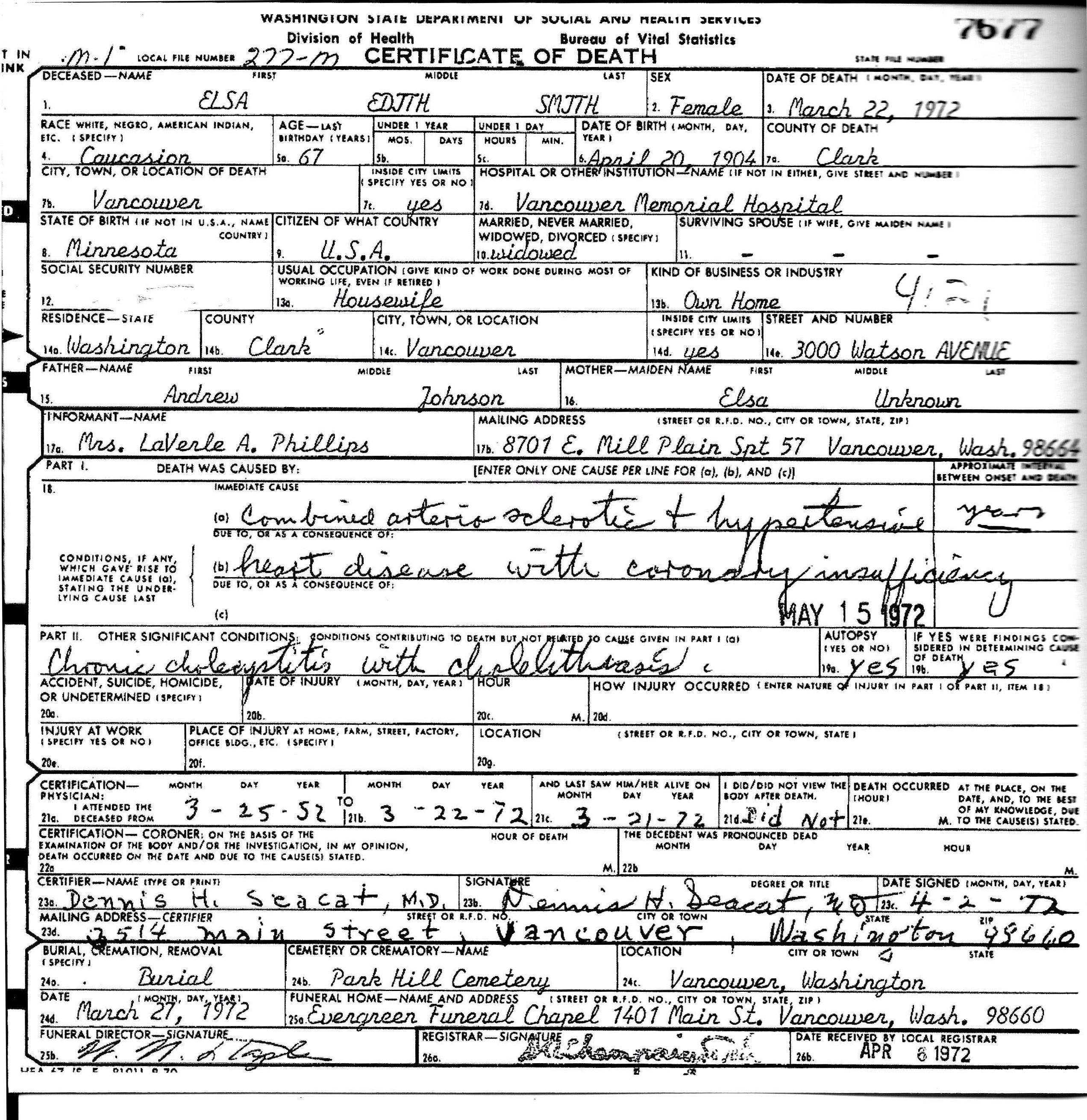 | Died: | March 22, 1972 in Vancouver, Clark Co, WA. View Obituary |