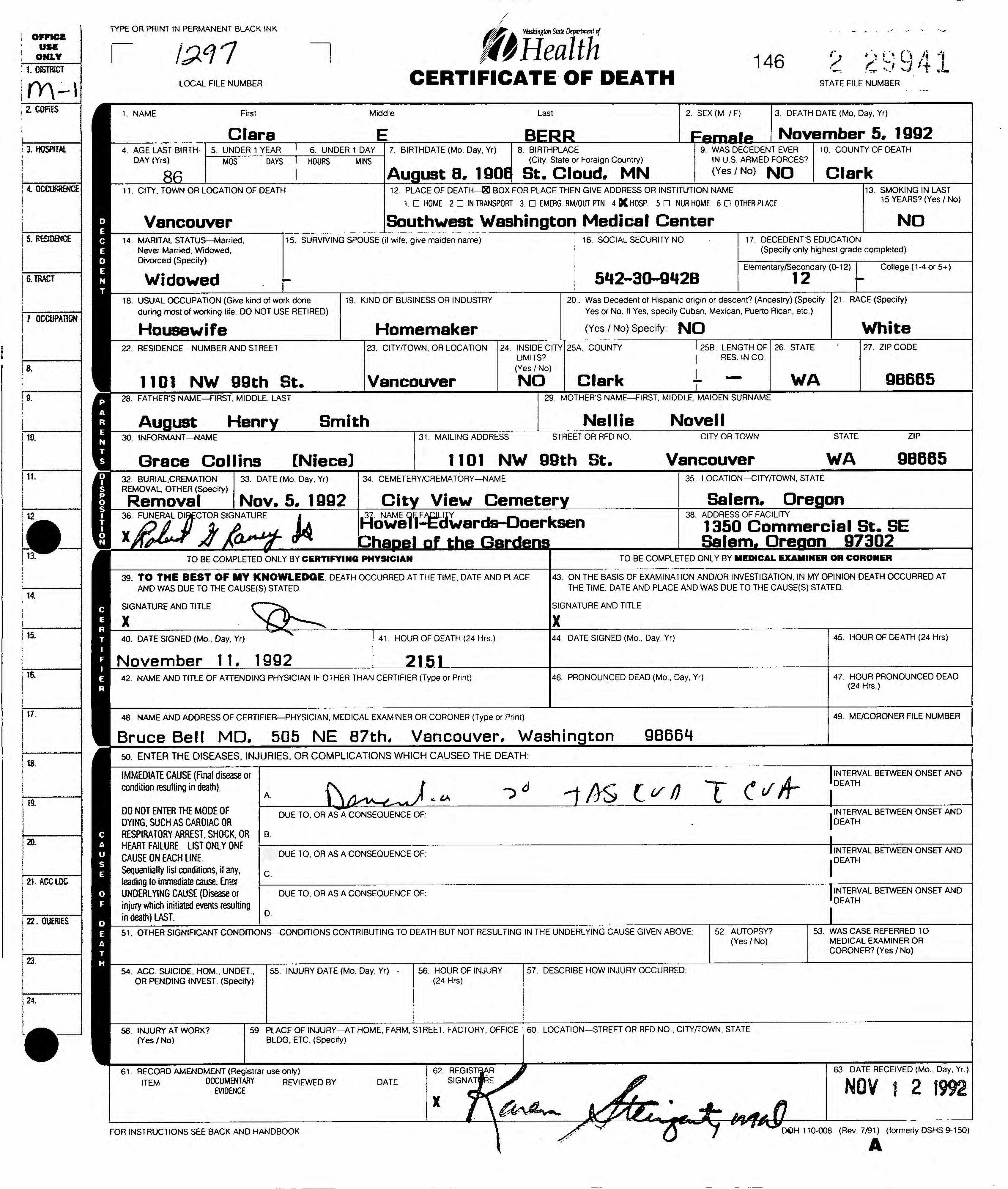 | Died: | November 5, 1992 in Hazel Dell, Clark Co, WA. View Obituary |