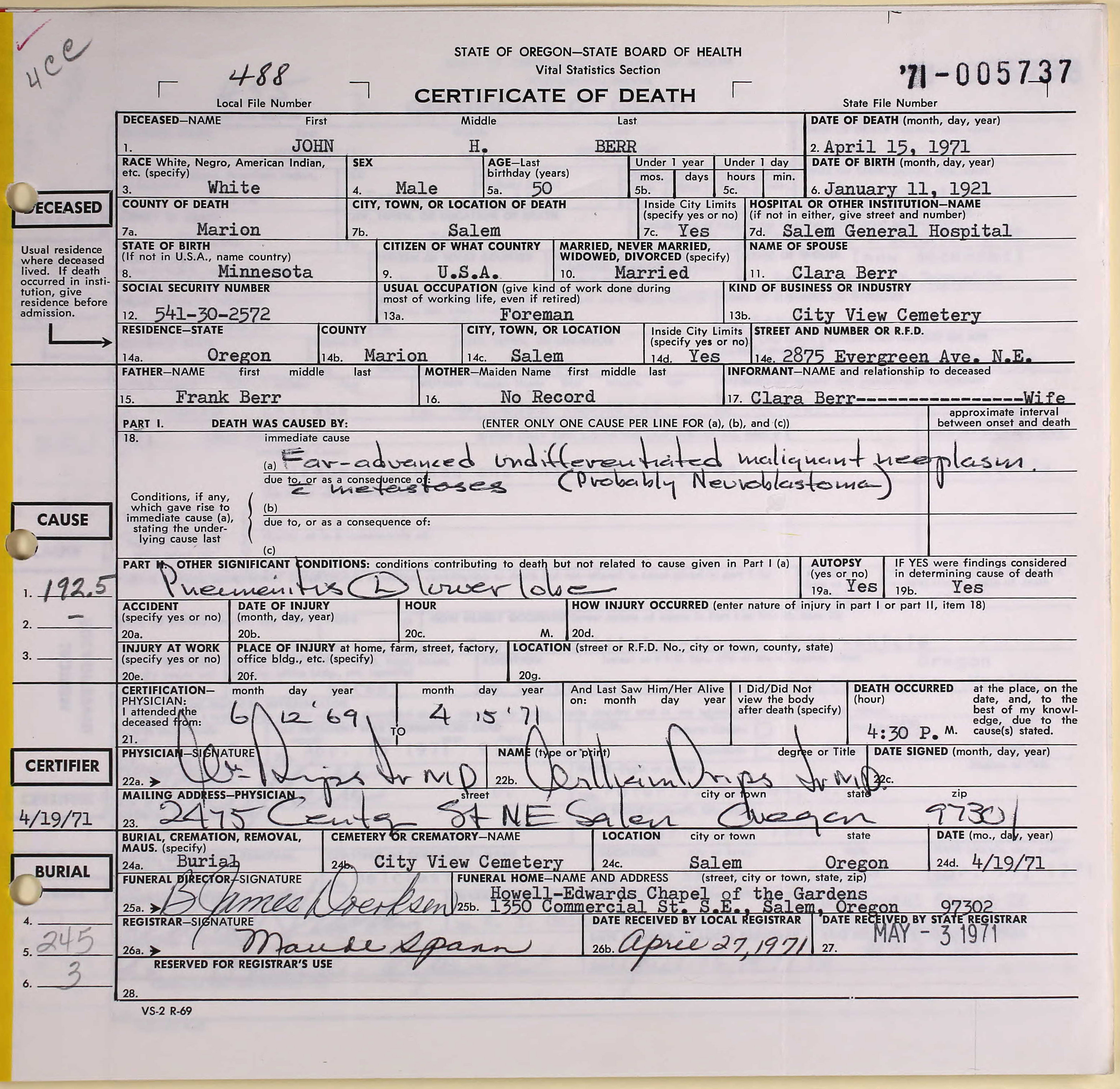 | Died: | April 15, 1971 in Salem, Marion Co, OR. View Obituary |