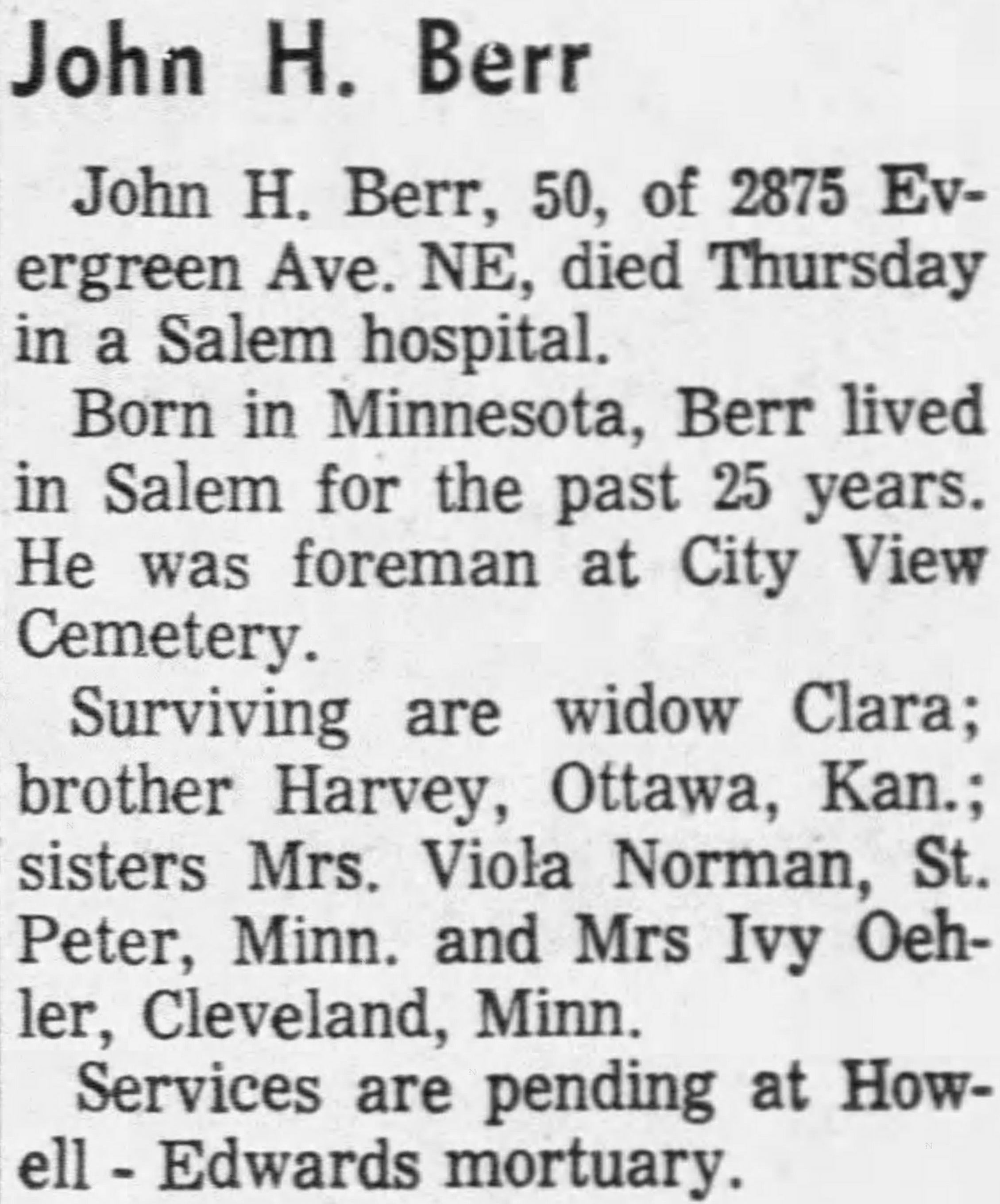 Clara married John Herman Berr on August 8, 1945 in Salem, Marion Co, OR.