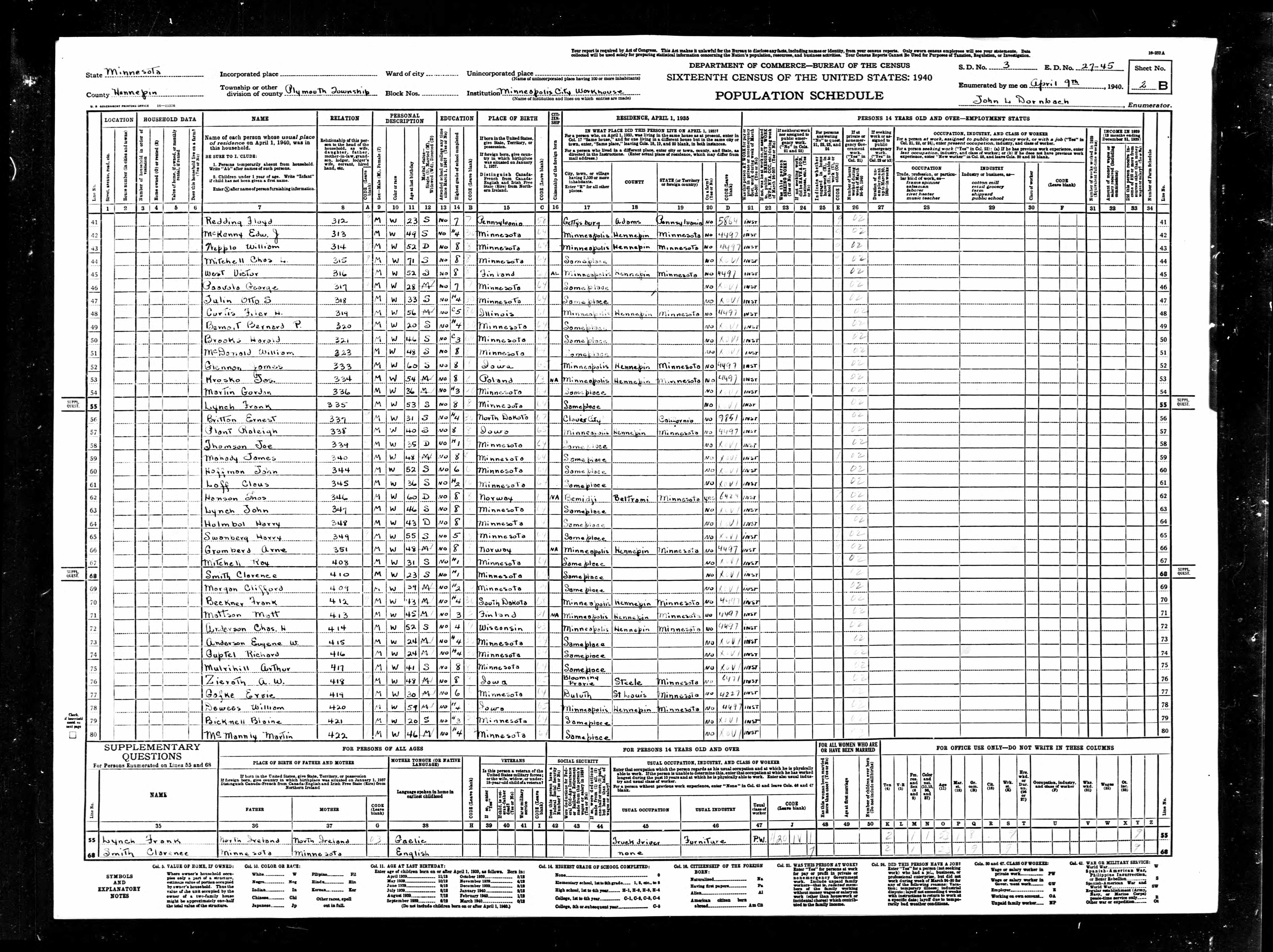 - 1940 Census - Minneapolis, Hennepin Co, MN (Listed as Clarence Smith, age 23, Resident 410)