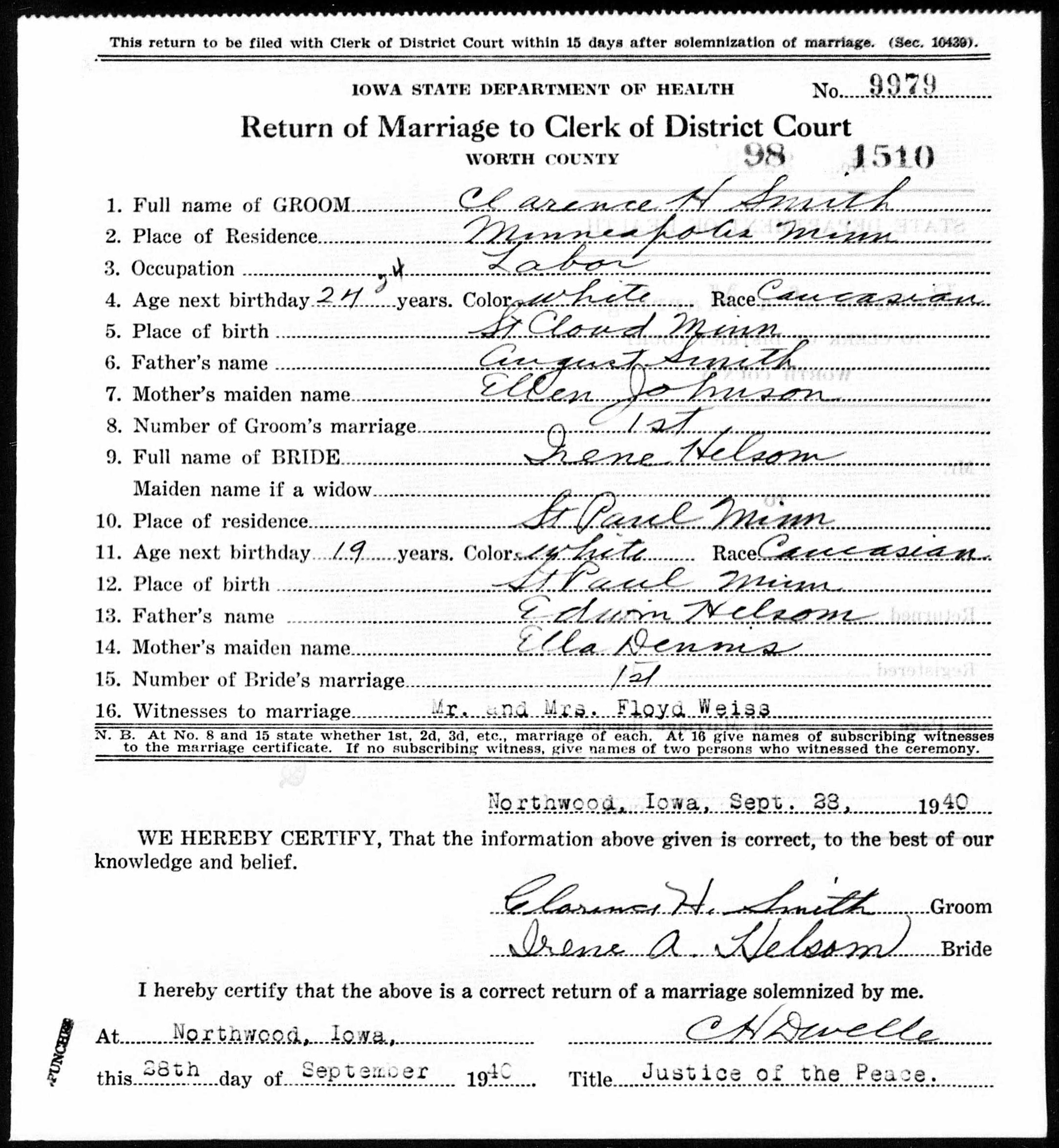 Clarence married Irene Amelia Helsom on September 28, 1940 in Northwood County, IA.
