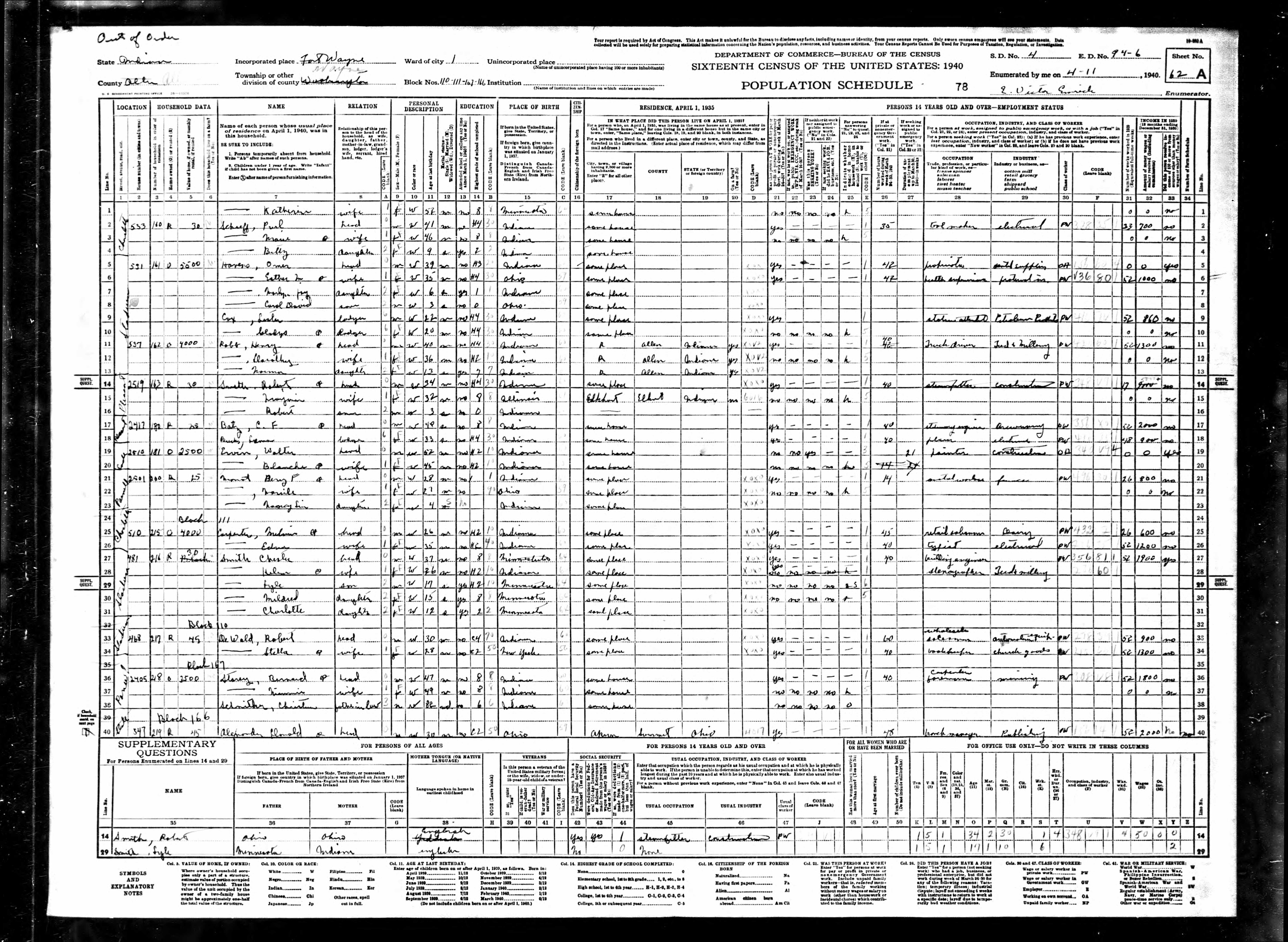 - 1940 Census - Fort Wayne, Allen Co, IN (Listed as Chester Smith, age 37, head of household)