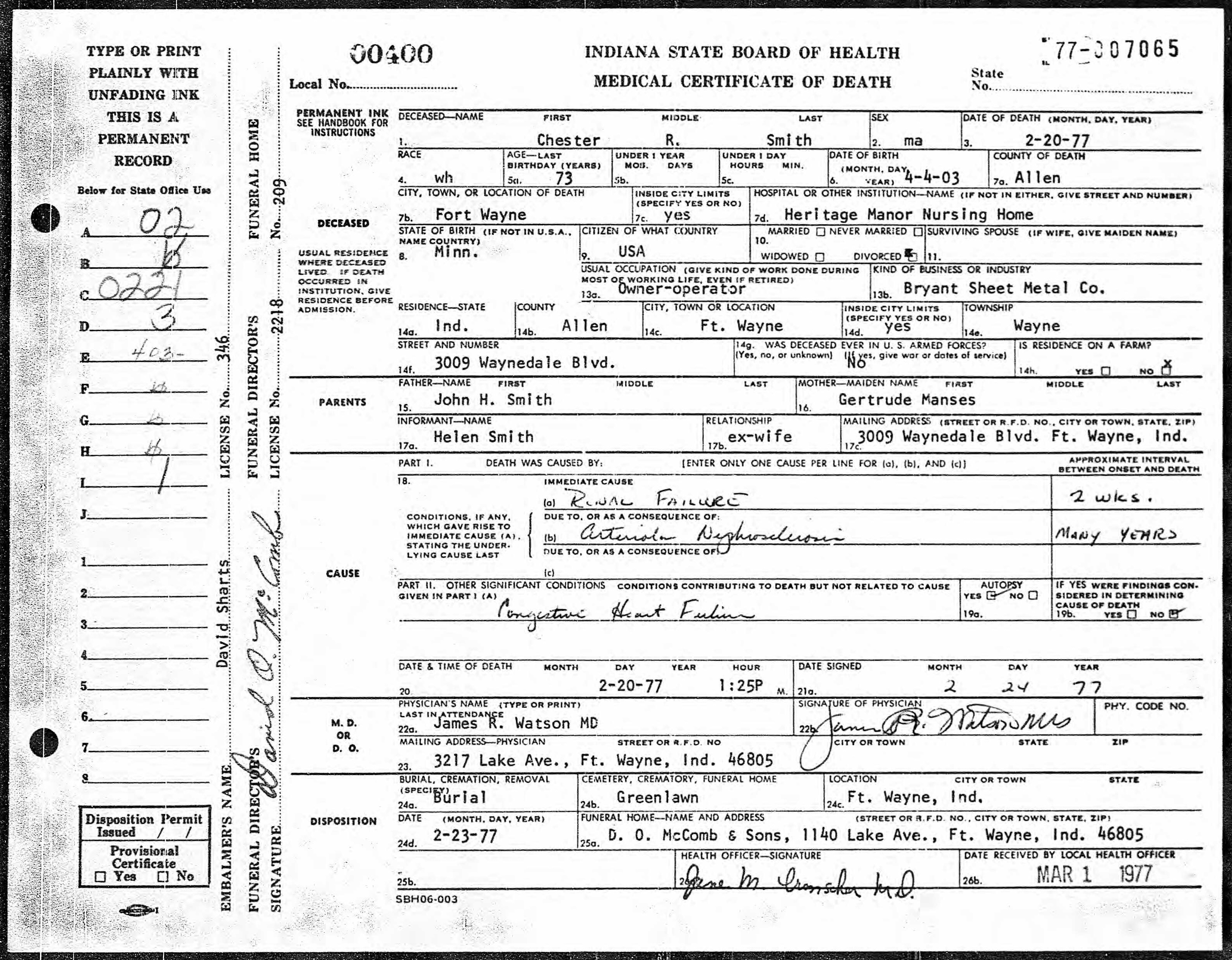 | Died: | February 20, 1977 in Fort Wayne, Allen Co, IN. |
