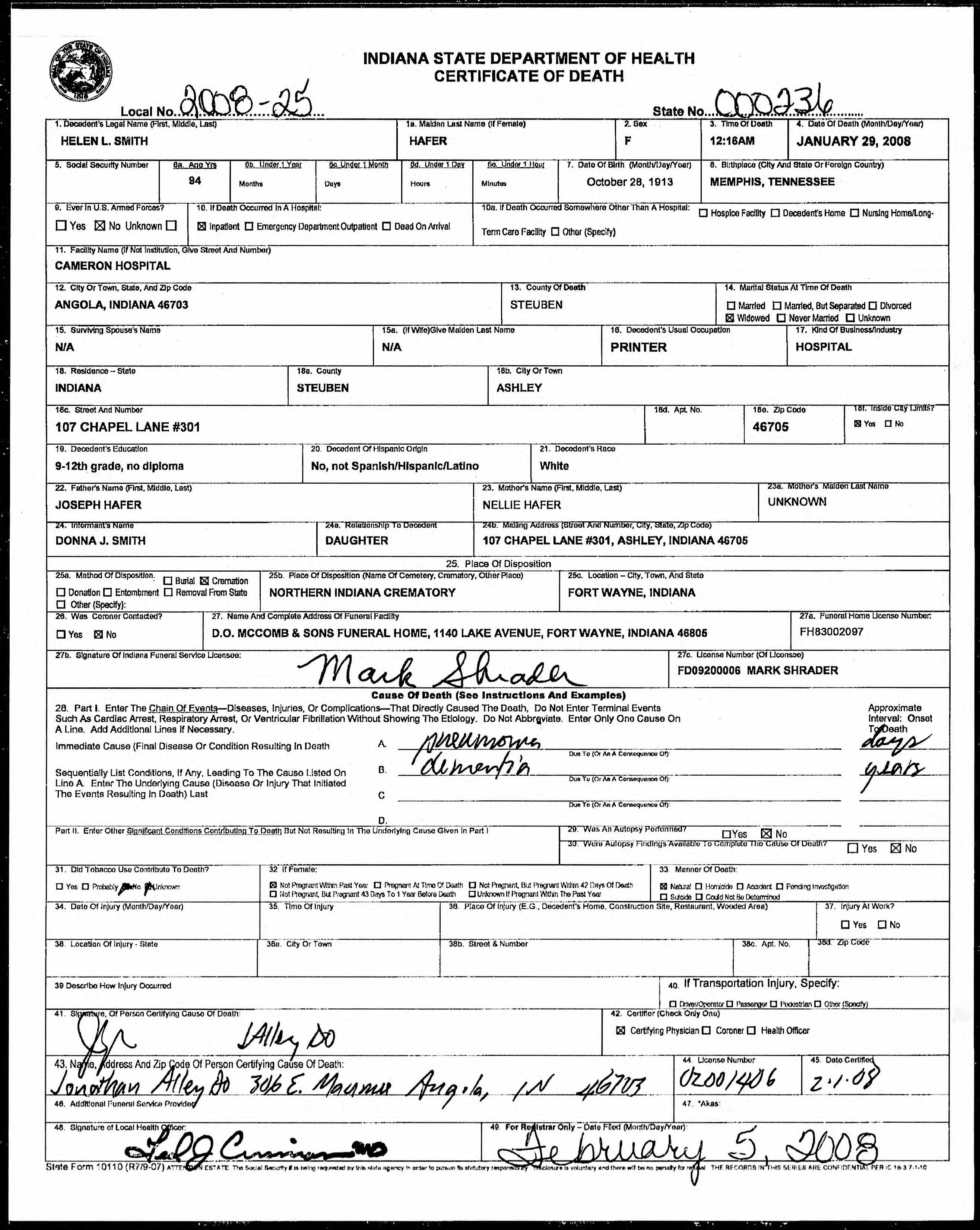 - Death Certificate - Death certificate for Helen