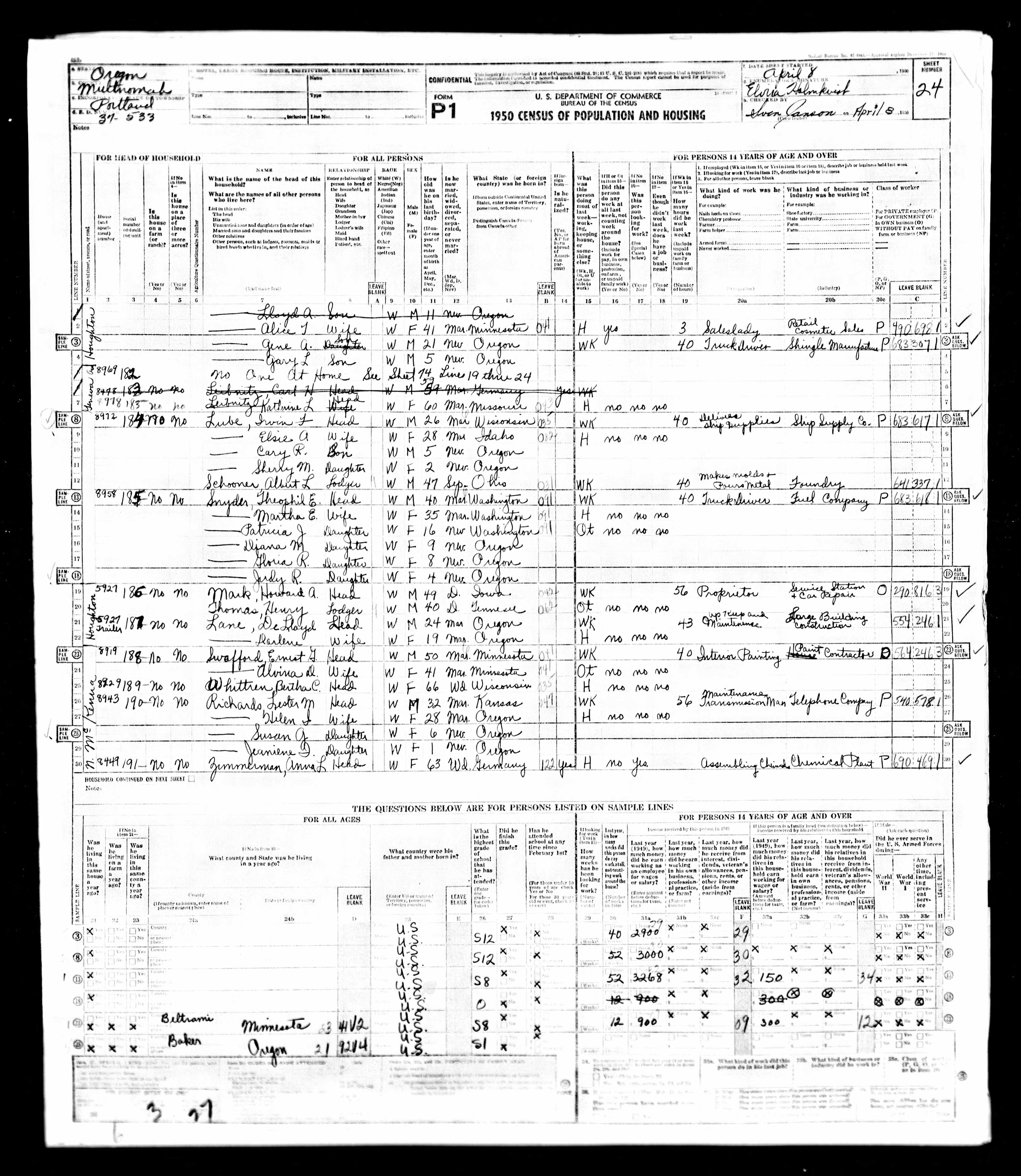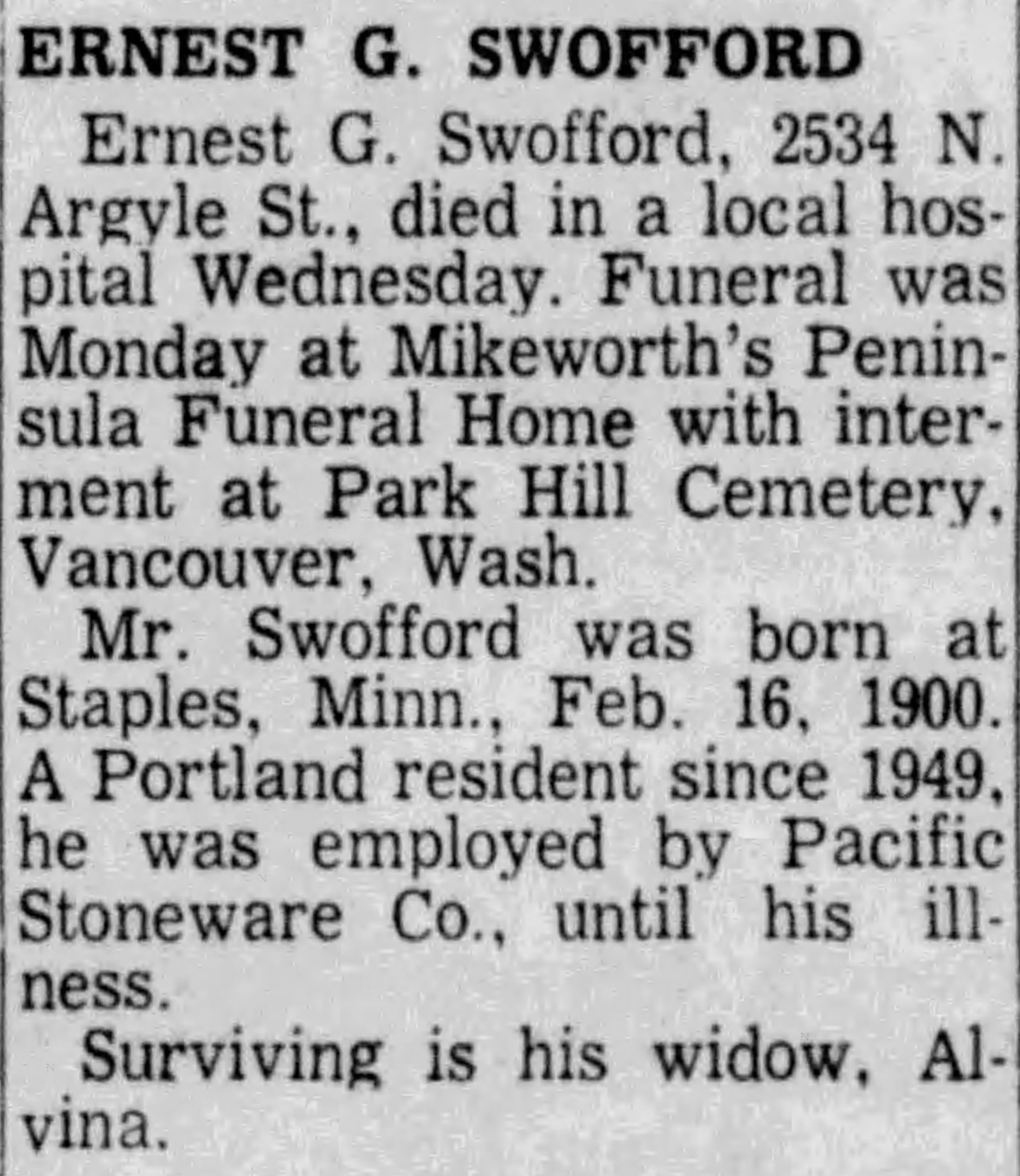 - 1950 Census - Portland, Multnomah Co, OR (Listed as Alvina D., age 41, wife of Ernest G. Swafford)