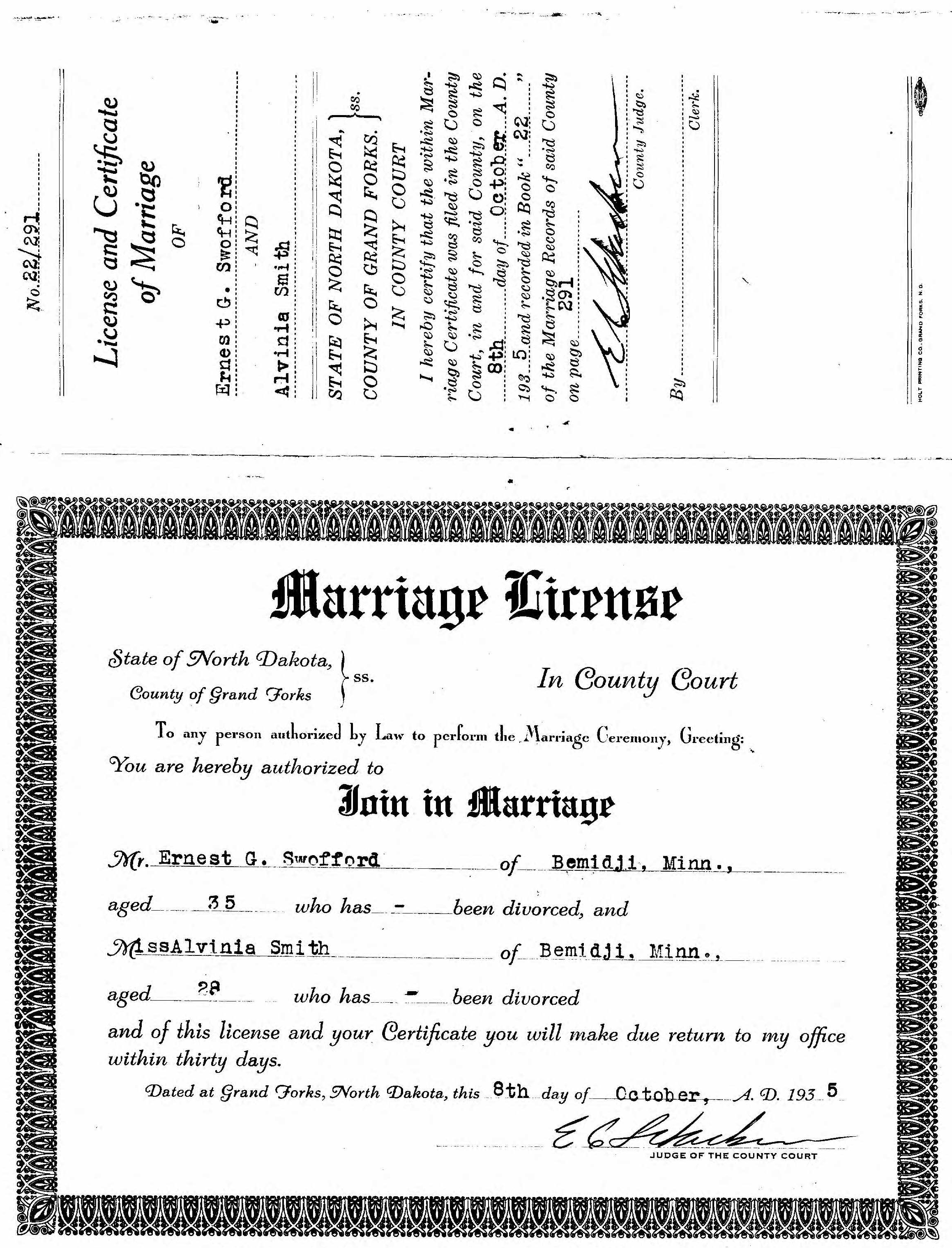 Alvina married Ernest George Swofford on February 11, 1928 in Grand Forks, Grand Forks Co, ND.