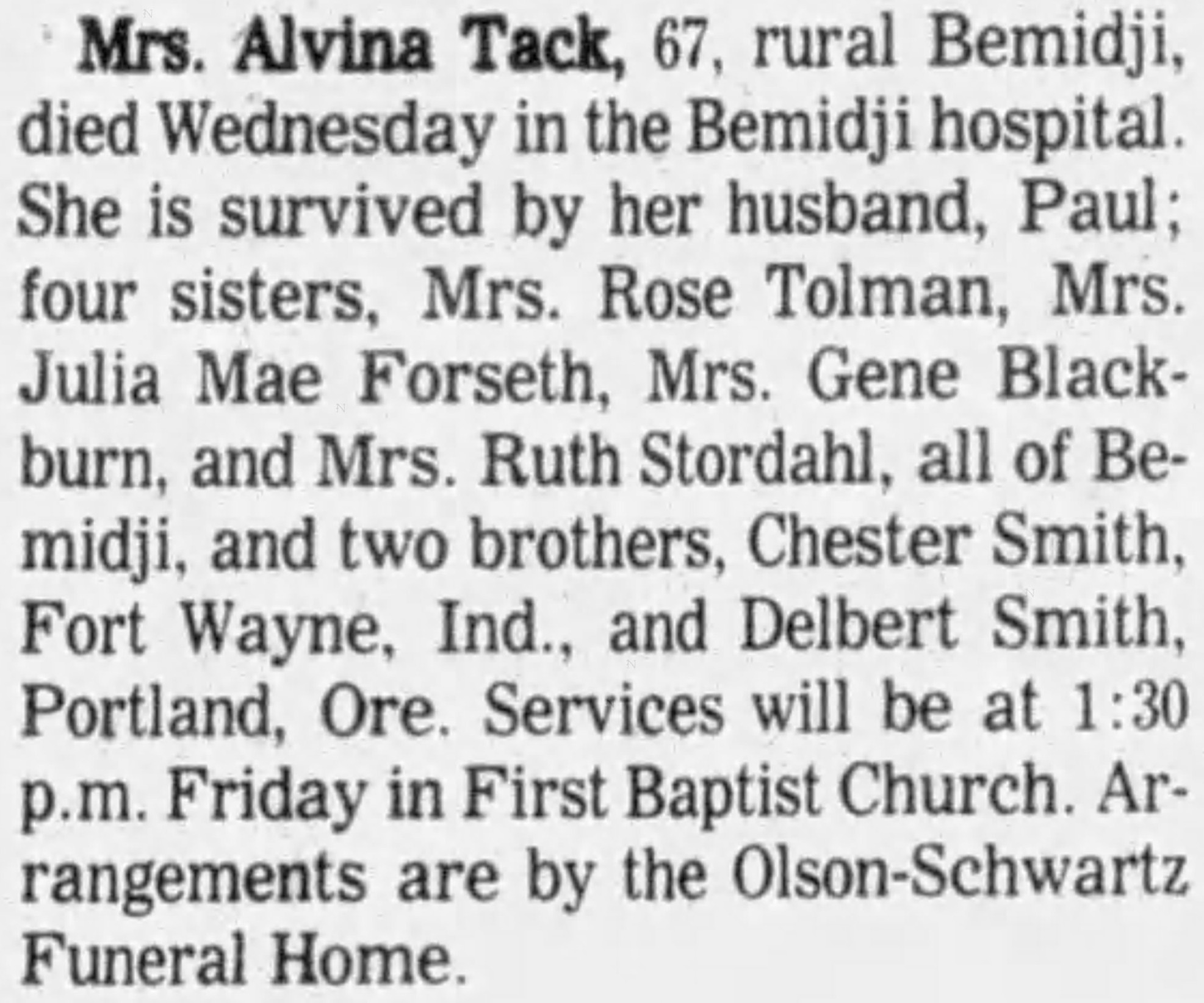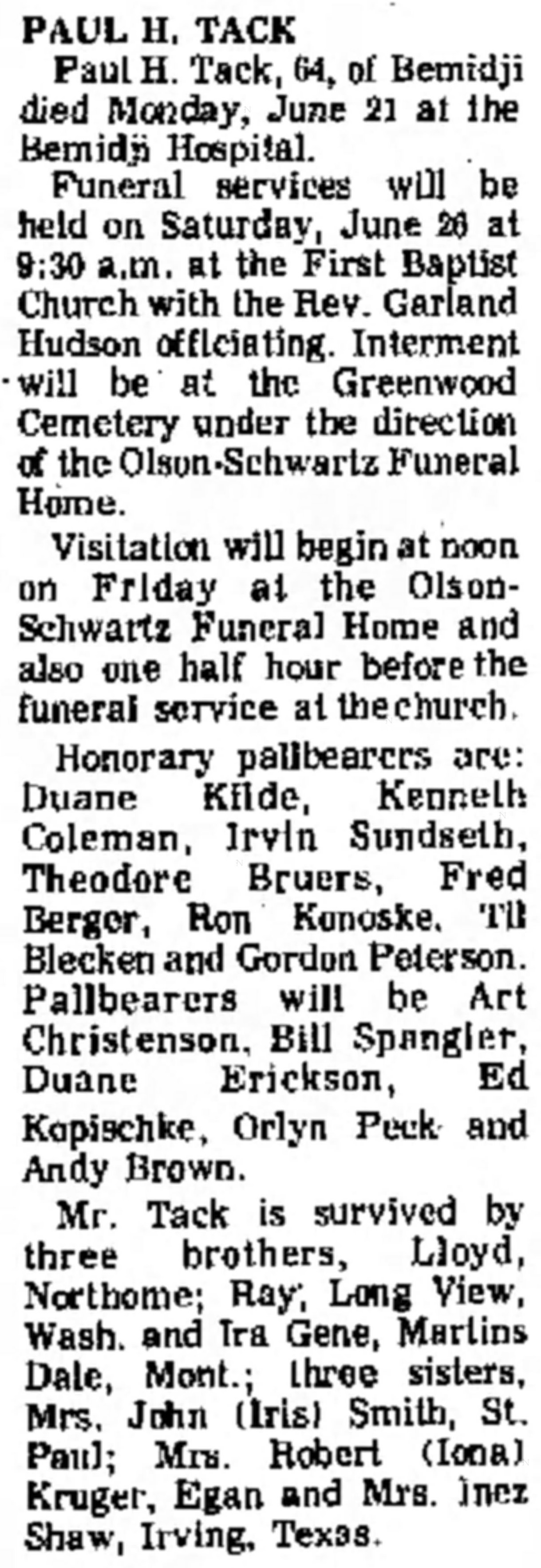 | Died: | June 21, 1976 in Bemidji, Beltrami Co, MN. View Obituary |