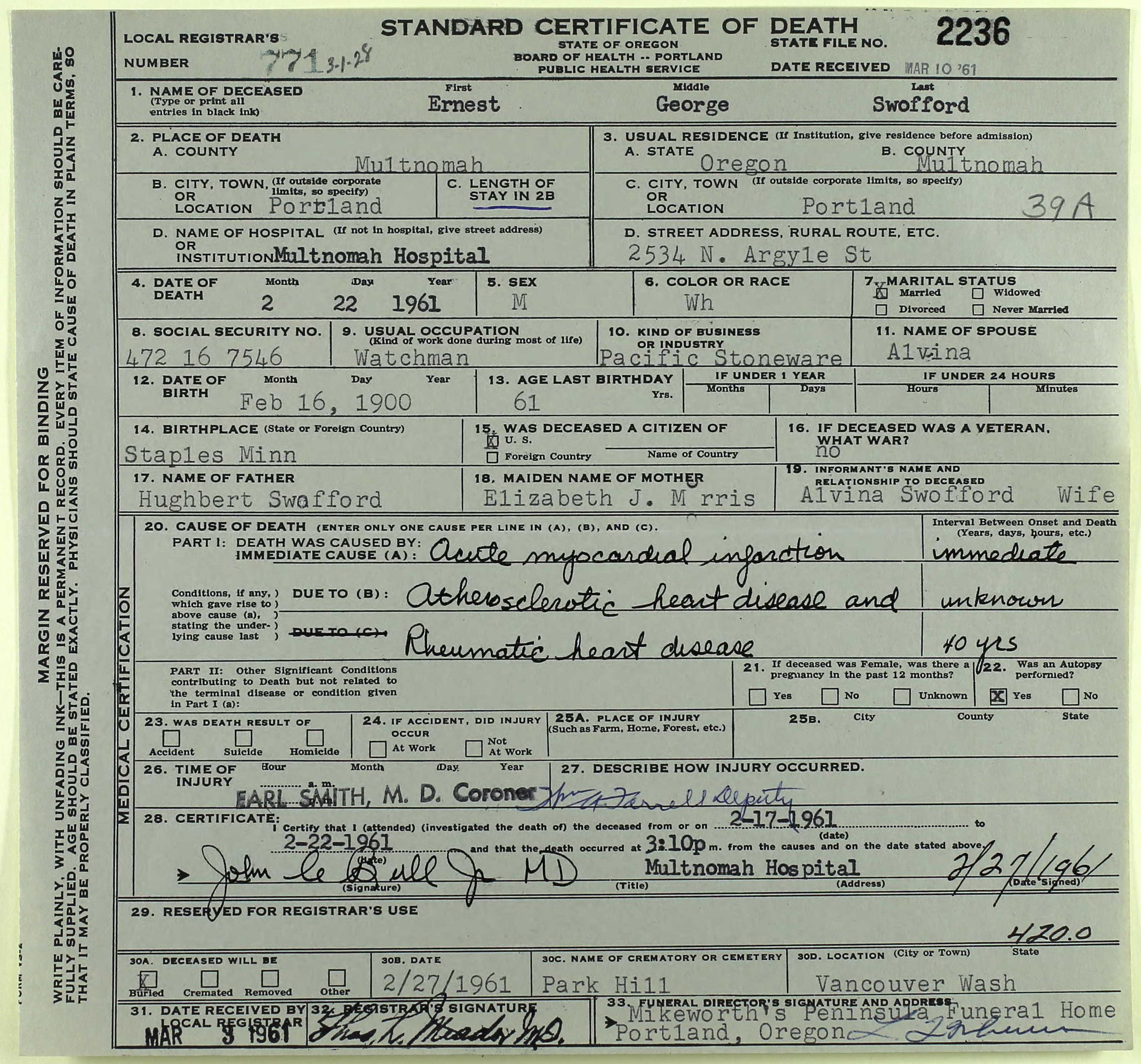 | Died: | February 22, 1961 in Portland, Multnomah Co, OR. View Obituary |