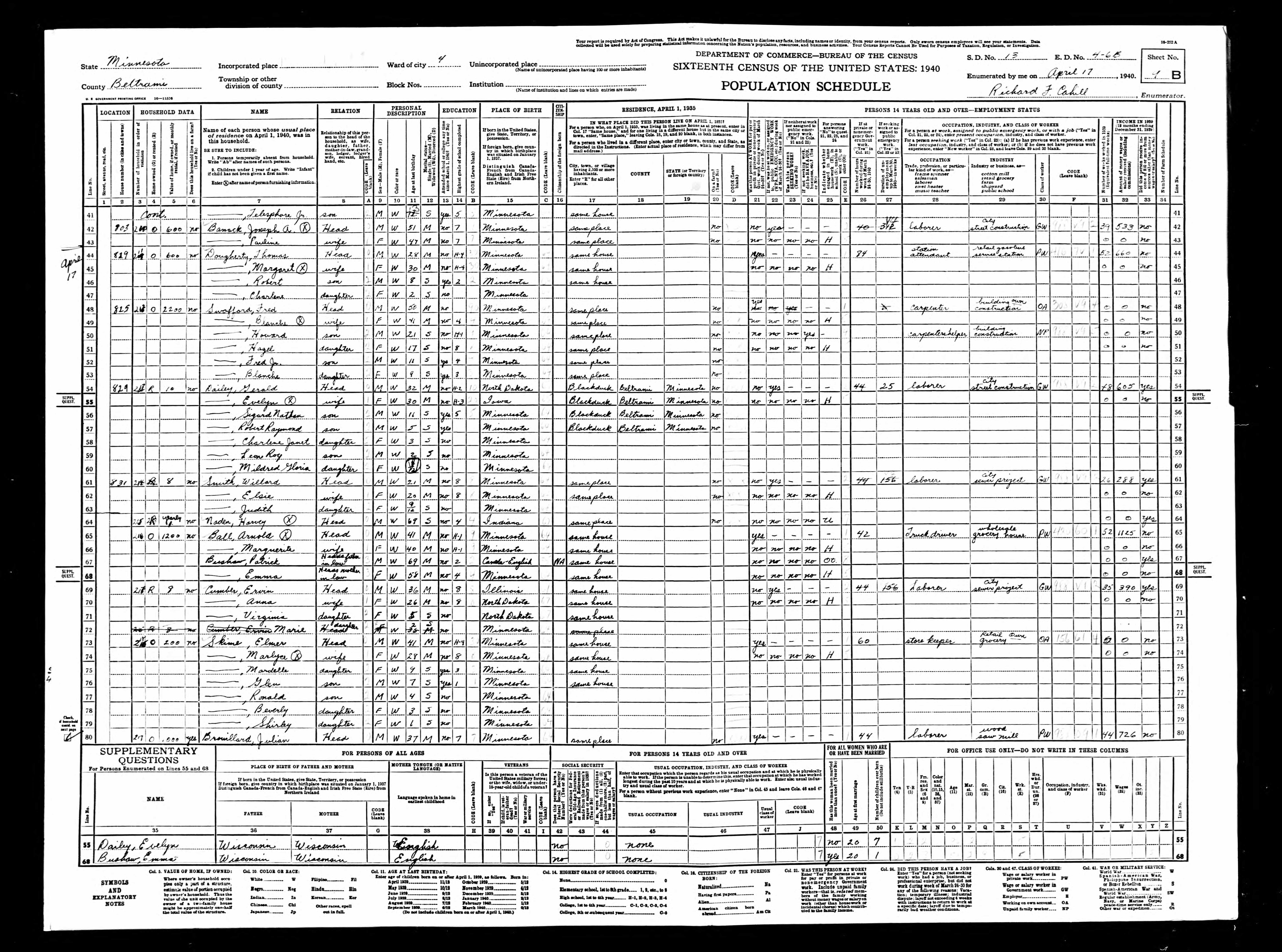 - 1940 Census - Beltrami County, MN (Listed as Willard Smith, age 21, head of household)