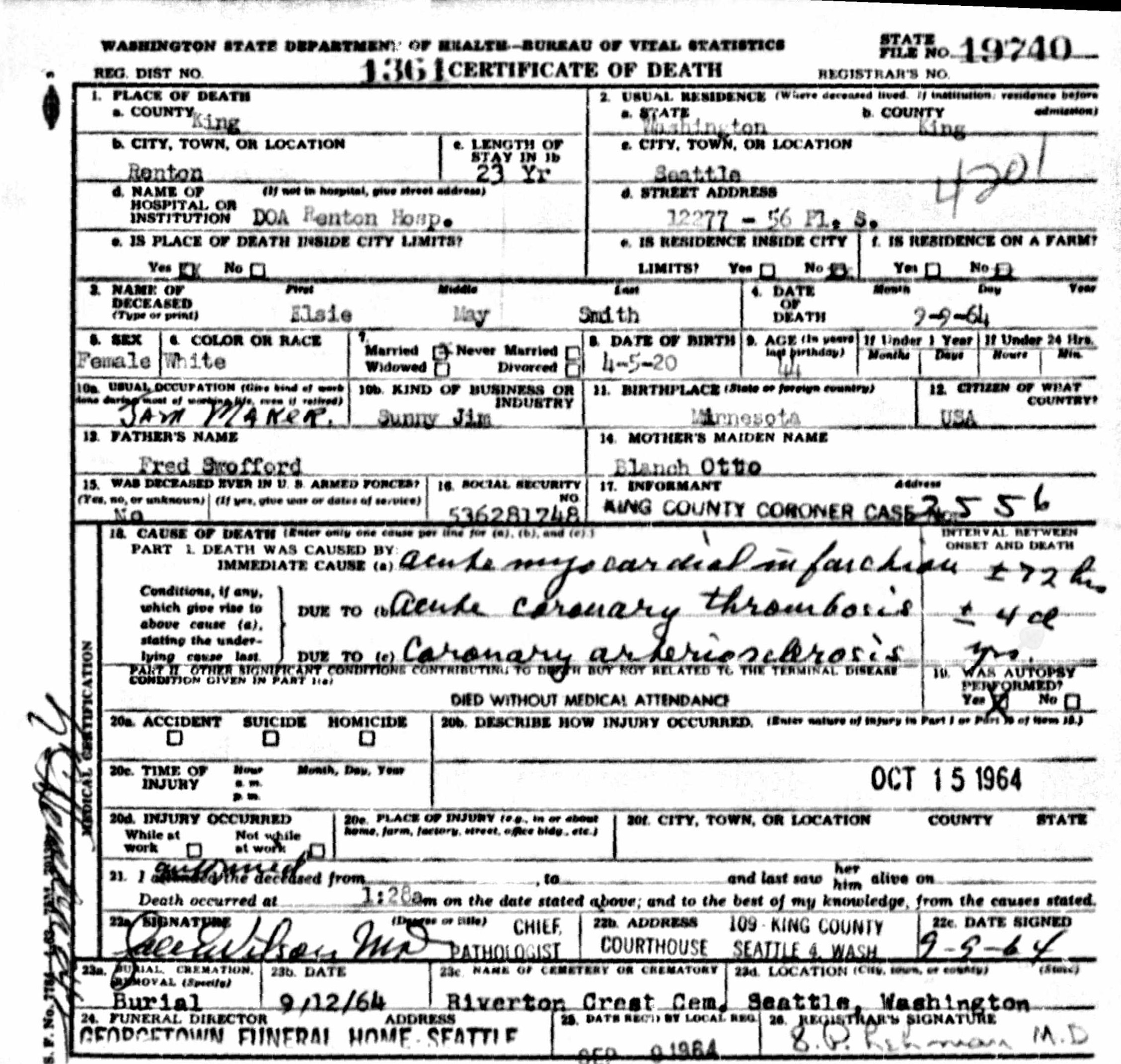 | Died: | September 9, 1964 in Renton, King Co, WA. |