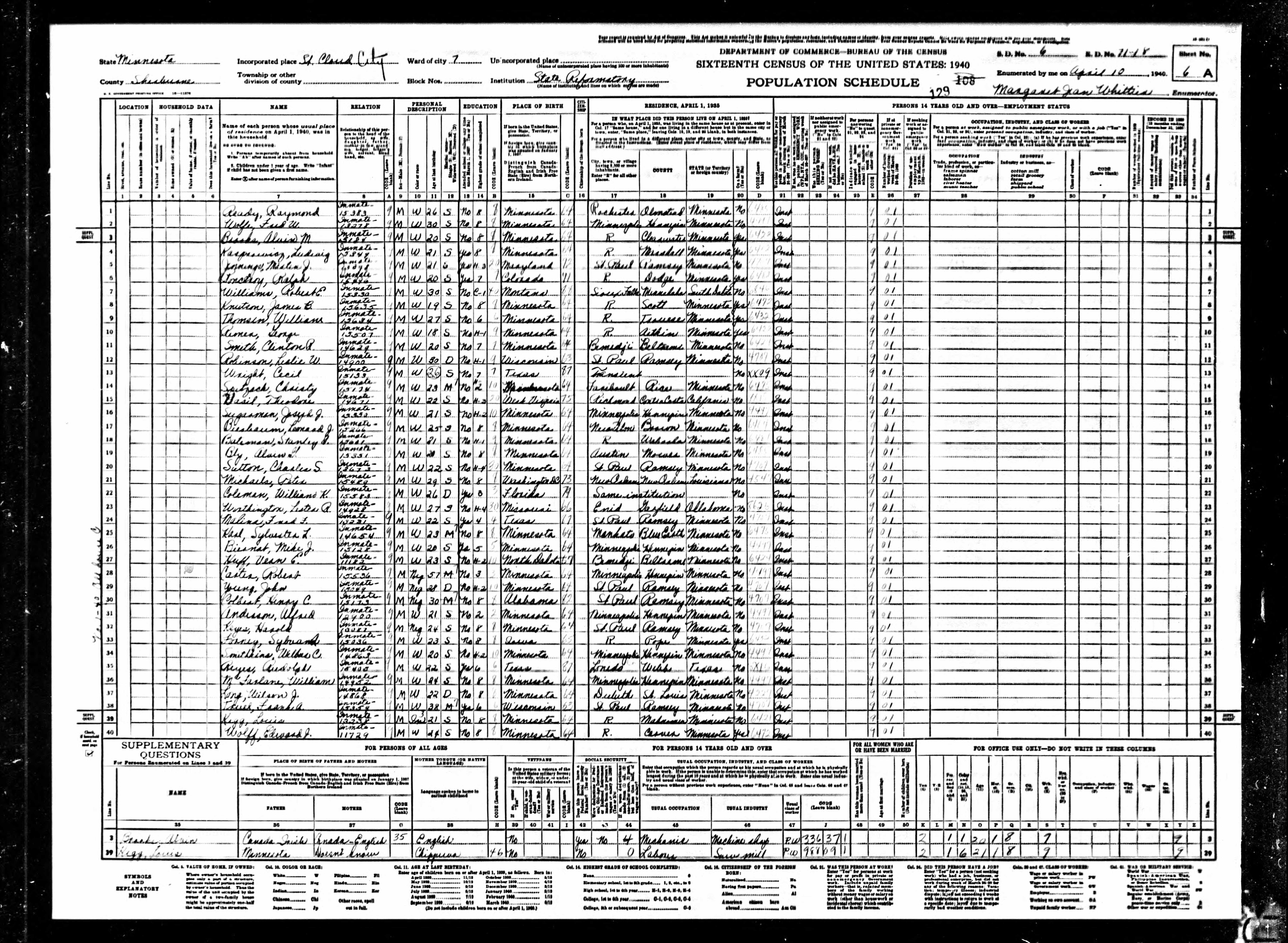 - 1940 Census - St. Cloud, Sherburne Co, MN (Listed as Clinton R. Smith, age 20, inmate at State Reformatory)